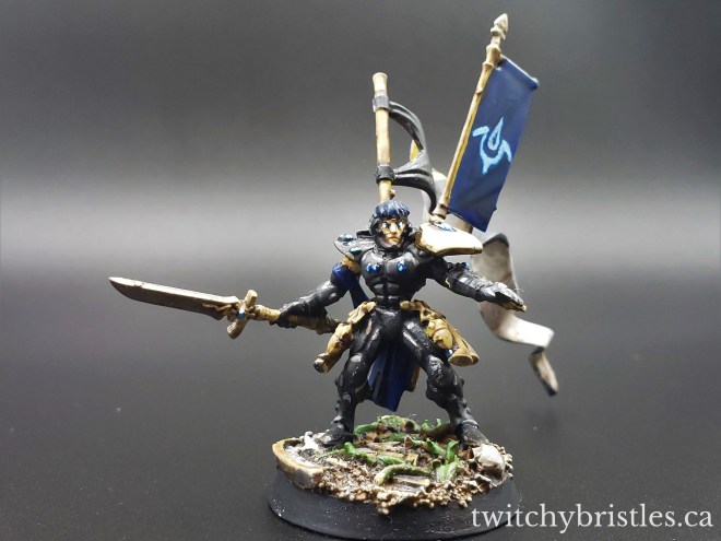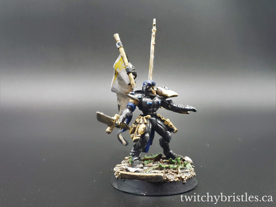 Matthias is a kitbashed HQ unit who I put together with bits from a whole slew of different models, most of them Dire Avengers. Mounted him up on a custom 32mm resin base and I’m really happy with the end result. No wings on this Autarch, he’s equipped for sword-and-board with a Star Glaive.