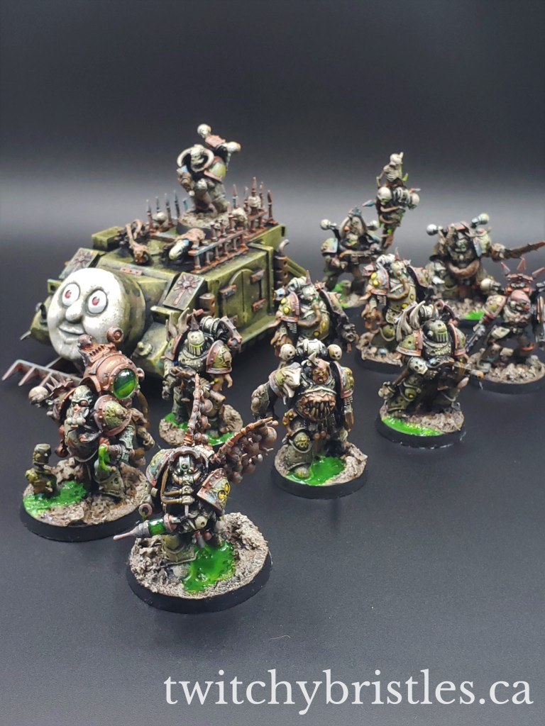 Pictured: A Biologus Putrifier and Foul Blightspawn leading Plague Marines forward.