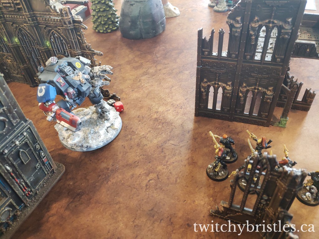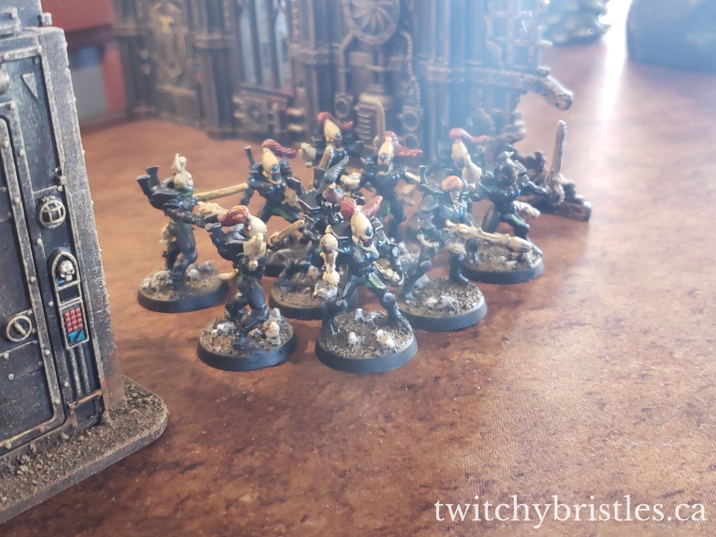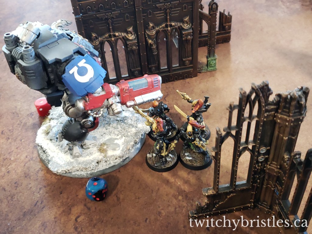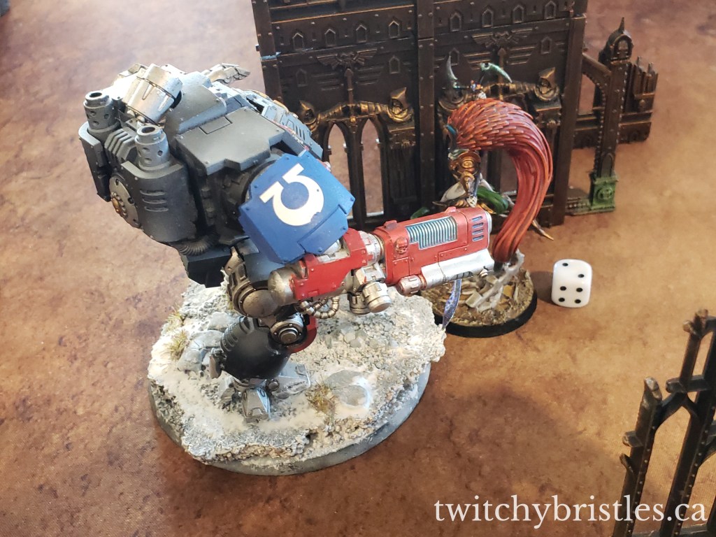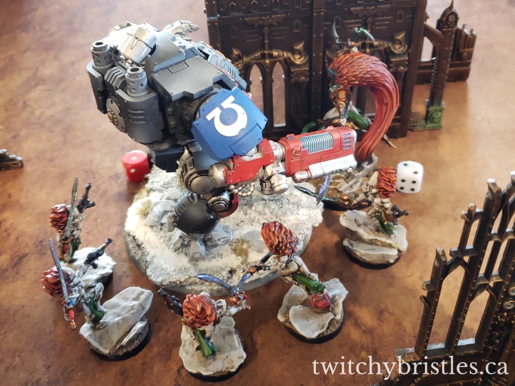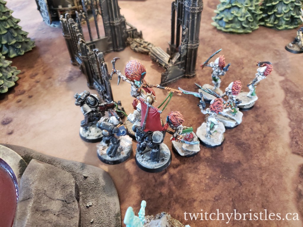 I brought a squad of Storm Guardians with fusion guns, my Howling Banshees, Jain Zar, and a Falcon transport and we went up against a squad of Primaris Intercessors, a Redemptor Dreadnought, a Primaris Captain in Gravis Armour, and an Inquisitor. The dreadnought was definitely the target that gave me the hardest time, but in the end my space elves recovered most of the supplies from their crashed cruiser’s debris and escaped.