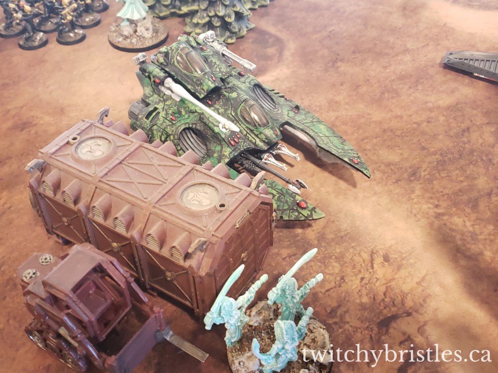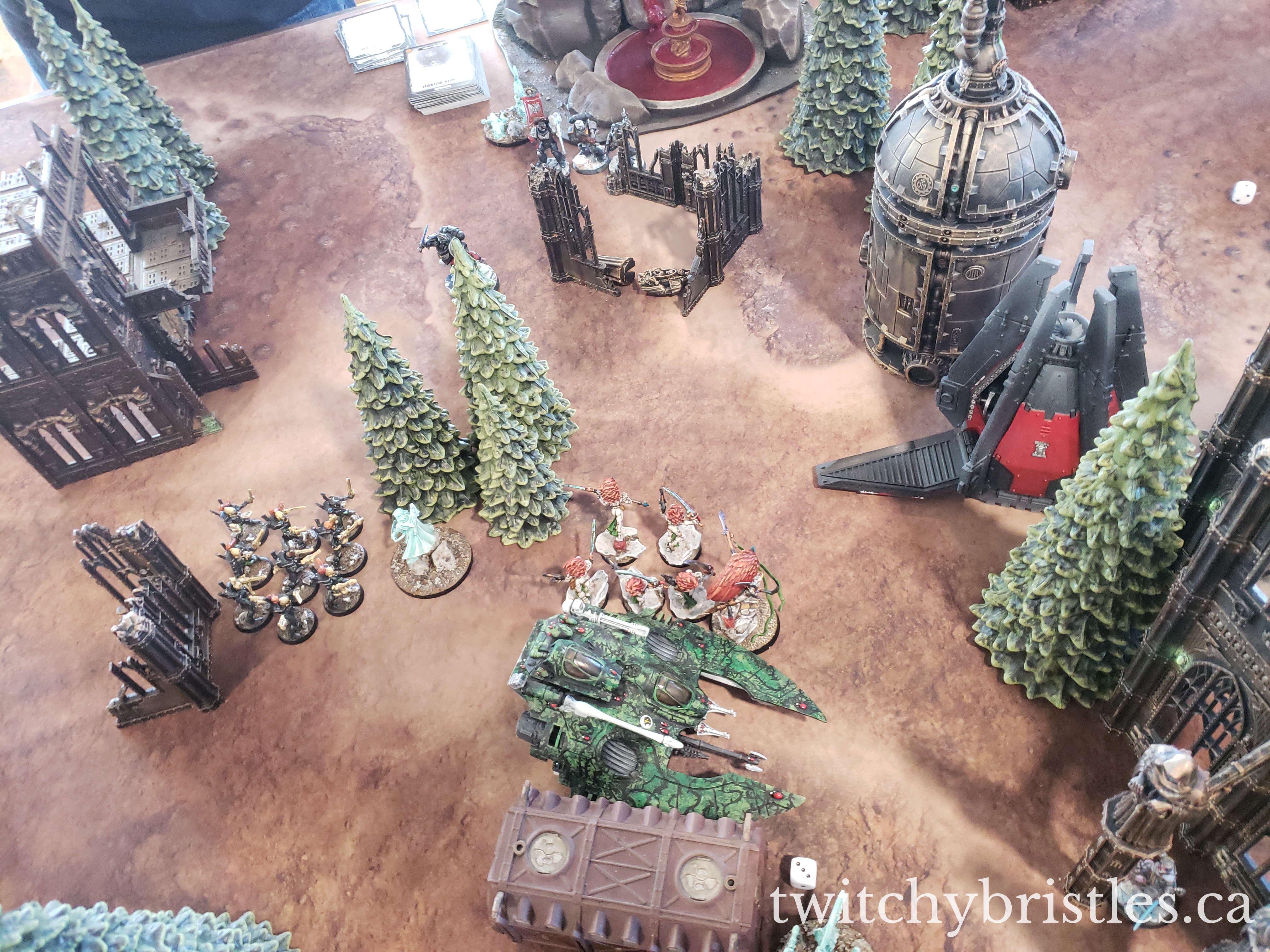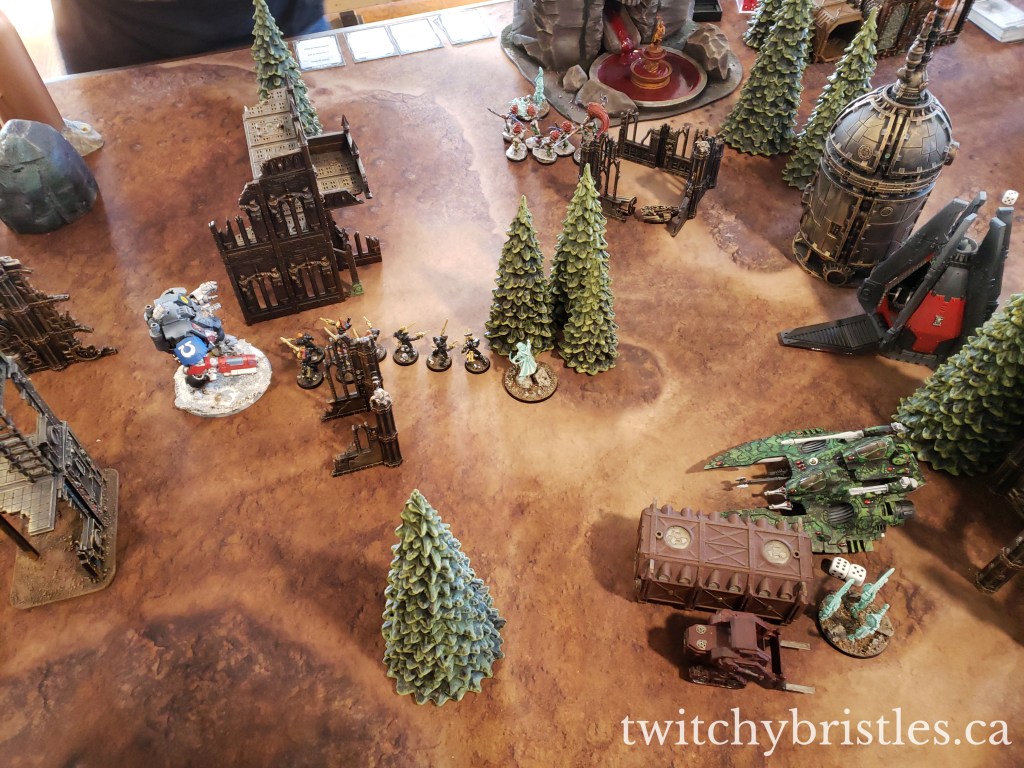 There were definitely some lessons learned this game but the fusion guns worked brilliantly, and I think I’m getting better at playing my Banshees to their strengths. Looking forward to switching my roster up a little for the next Eldar game, and looking forward to debut my Death Guard on the tabletop sometime soon, too, in this campaign. As always, I can’t say enough good things about Noble Miniatures and about their table setups. They’re a phenomenal shop and made for some great pictures, and a great starting point for our Crusade.
