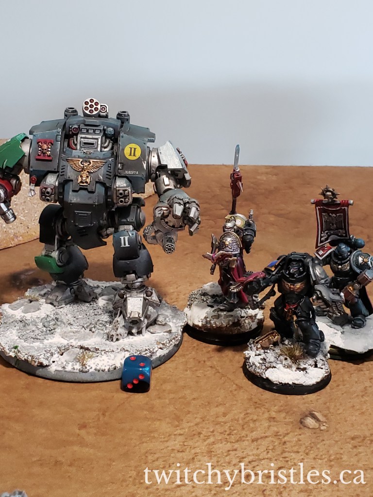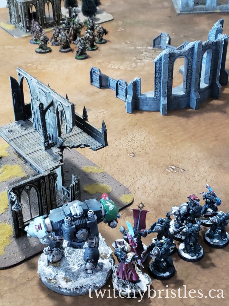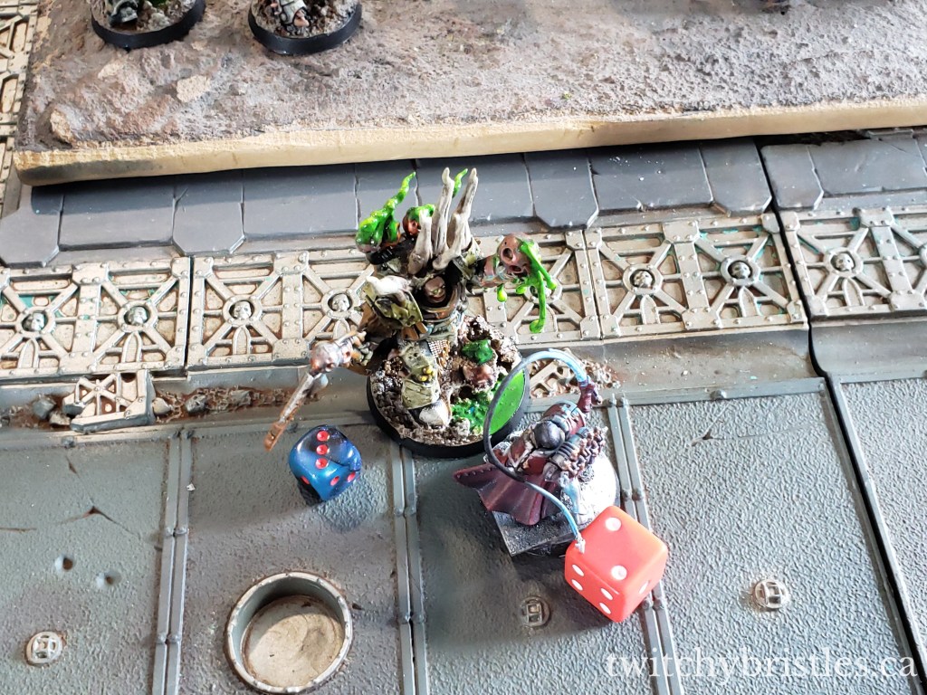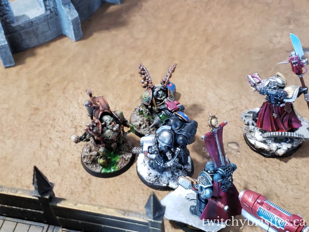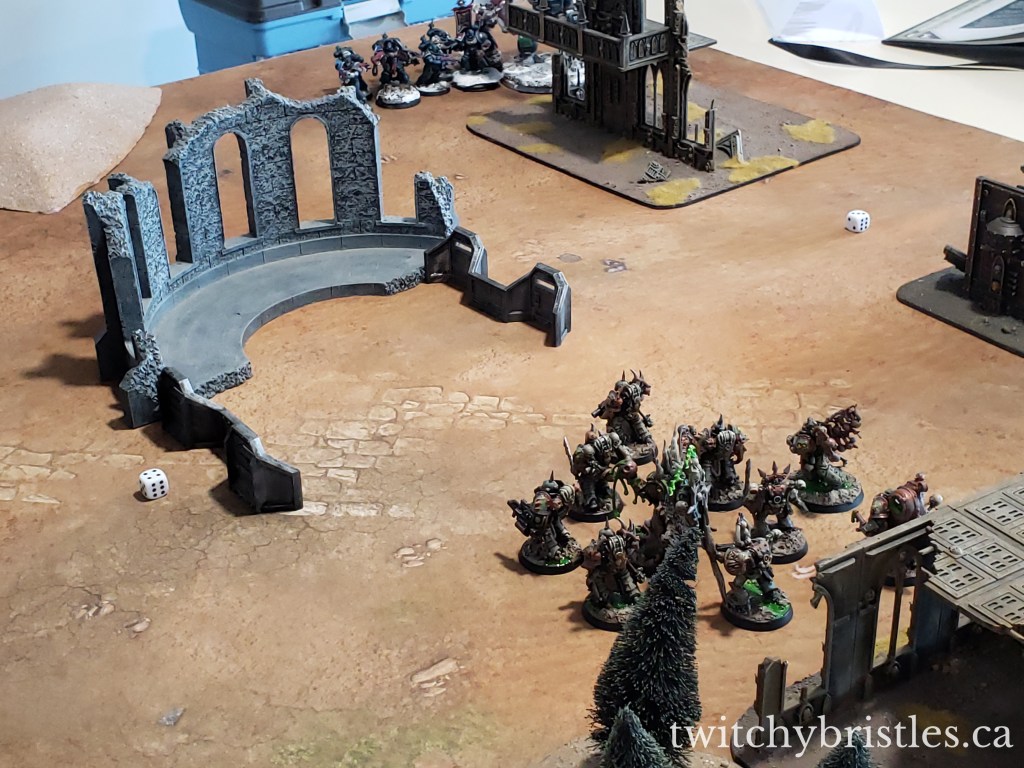 I think in some ways I learned more in the second game, on a much more open board, against the Death Watch. Compared to Eldar, I definitely need to be more conscious of movement limitations, and I need a solid “delivery method” for my heavy hitters. KinpatsuSamurai won this one by a pretty wide margin, but the final melee between the Death Watch and my Biologus Putrifier and Foul Blightspawn was – pun once again intended – a blast.