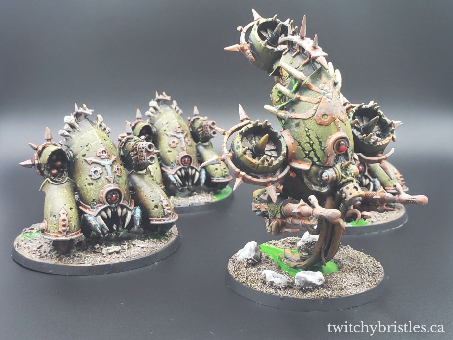 I really like the design of this kit from a visual perspective, and now that I’ve finished one I might have to look into picking up another one or two down the road. From a game standpoint they’re pretty swell, and especially after being all painted up I feel like it’s a model with a lot of personality. As always, Nurgle’s Daemon Engines are great to look at, and are small enough that they don’t feel like a chore to paint up along with another batch.