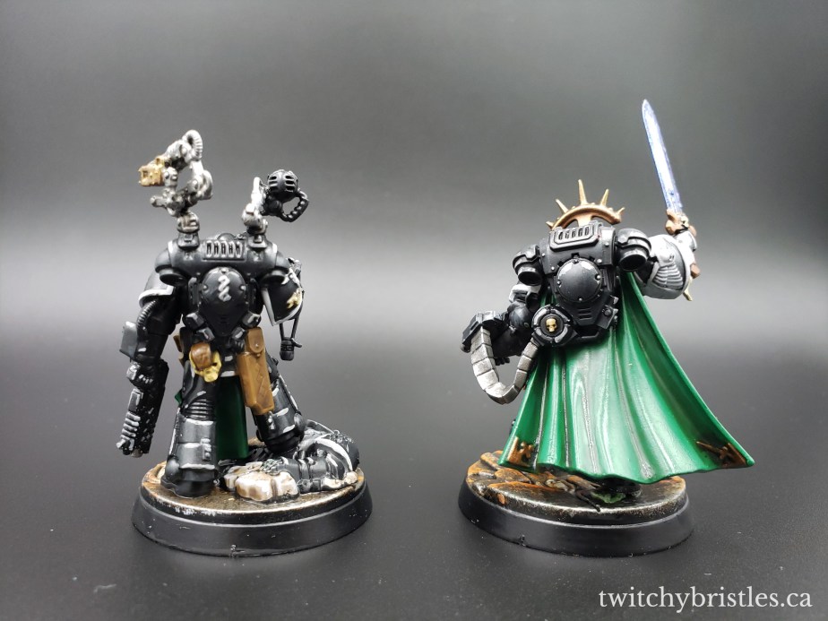 Pictured: A Primaris Apothecary, right, and a Gravis Captain from the Know No Fear / Dark Imperium boxset.