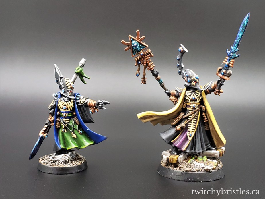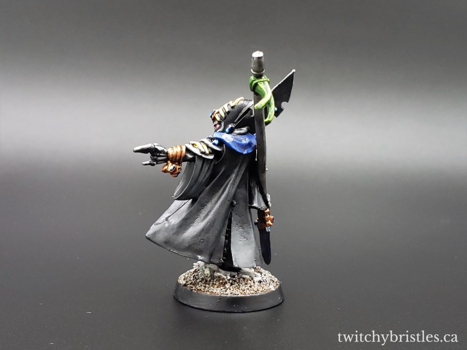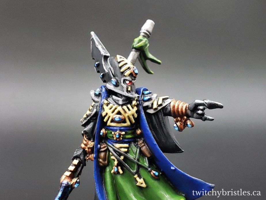This model has been through a bunch of different iterations and versions over the years, and this one is meant to be a sort of “promotion” for Ry’hil, a Bonesinger character of mine who’s featured in previous galleries and who plays a big role in one of my Crusade campaigns. I’d been running him as a Farseer for a while, and he’s put in some pretty heavy work against my roommate’s Tyranids in that capacity, so it’s satisfying to see this character finally get his due – even if he is a little bit down in stature from Eldrad, thanks to the game’s very-real size-creep.