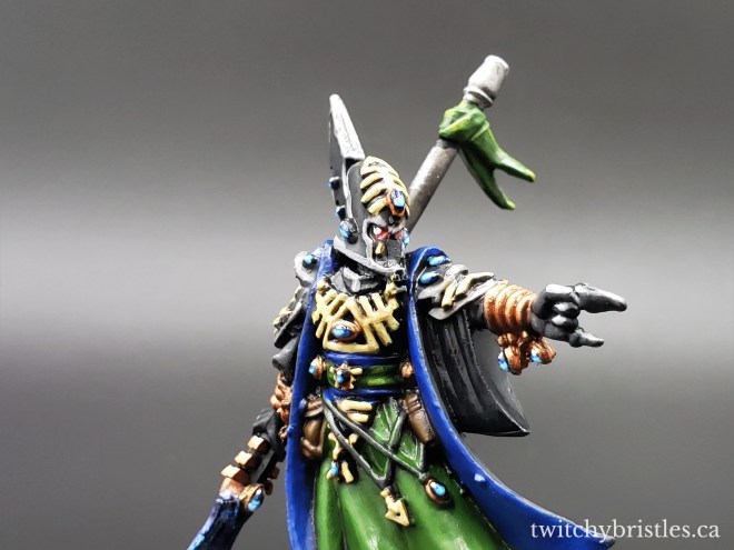 This model has been through a bunch of different iterations and versions over the years, and this one is meant to be a sort of “promotion” for Ry’hil, a Bonesinger character of mine who’s featured in previous galleries and who plays a big role in one of my Crusade campaigns. I’d been running him as a Farseer for a while, and he’s put in some pretty heavy work against my roommate’s Tyranids in that capacity, so it’s satisfying to see this character finally get his due – even if he is a little bit down in stature from Eldrad, thanks to the game’s very-real size-creep.