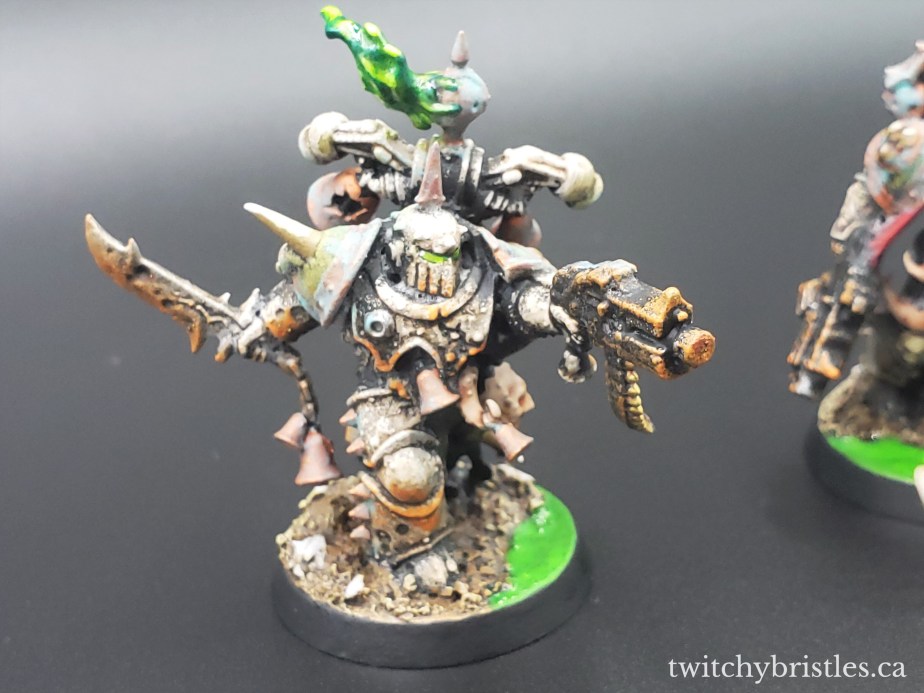 Most of these are just stock models on my usual custom, Nurgle-y bases, though I did upgrade the Plague Marine with the plasma gun to be holding a homebrewed plaguebelcher, fashioned from some of the spare bits from my Artel W Sister Pestilencia kit. The models were a breeze to put together, and just like my other recent batch I’m much happier with the balance and blend of colors that came out of this group. They pop a lot more on the tabletop, but are still very, and suitably, disgusting.