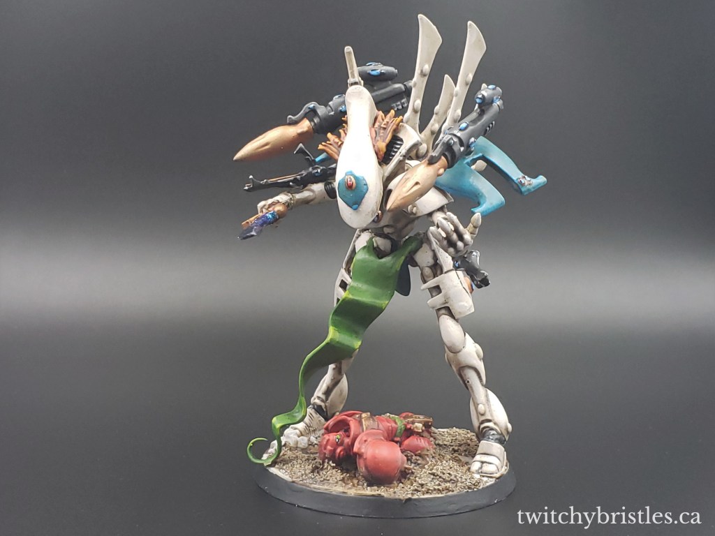 Out of the Wraithlords I’ve got right now I can safely say that this is the most dynamic-looking out of them, and I’m glad that the rebuild/rescue on this had such good results. Big Sister is still hard to beat for me because I love the “classic” Wraithlord look, but I think this still turned out pretty great. I might go back at some point and change the basing – the fallen Aggressor looks pretty neat, but I think I could put this onto a base that would match the rest of the Howling Banshees I have kicking around as well.