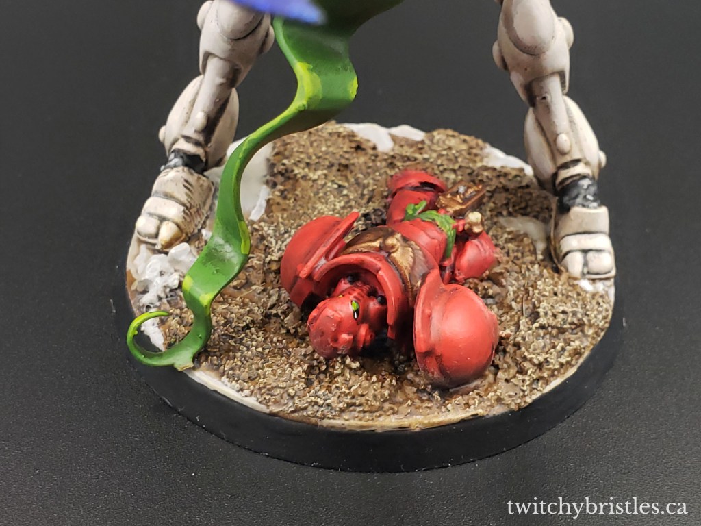 If this counts as a “Fembruary” challenge entry, it does so only on the technicality that the Howling Banshees are a female aspect of Kaela Mensha Khaine, the shattered war god of the Eldar. (But I kind of hope it still counts!) I always liked the idea of painting up Wraith constructs to match or integrate with their old lives or old squads, and my last attempt at painting a Banshee Wraithlord (Big Sister) turned out pretty good, so I thought I’d give this another shot. What made this challenging – but also incredibly rewarding – is that this was a rescue model that was in particularly hard shape when I got started.