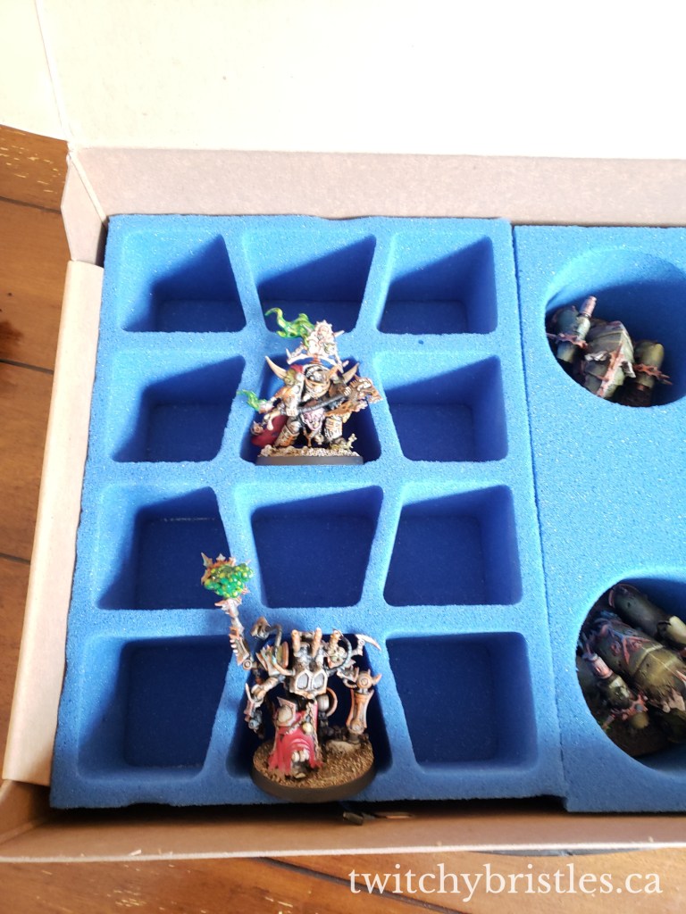 Where things got dicey – and I expected them to get a little dicey – was with the Death Guard. I had concerns that I was probably going to have to modify some of the trays to work for some of the more dynamic-looking miniatures, and for some of the larger characters. Some characters, like Lord Felthius and like my Abraxazz Hierophant, just wouldn’t fit into the tray at all, regardless how I tried to reposition them. Some, like the Malignant Plaguecaster and Lord of Contagion, fit but only barely in the larger parts of the “Terminator” tray. I don’t really see this as a “KR” issue however – it’s hard to make a one-size-fits-all container for GW’s Death Guard terminator and character-scale models given the amount of sizecreep we’ve seen in 8th and 9th edition, and…to be frank, Abraxazz isn’t even a GW model, so that one’s a big mea culpa.