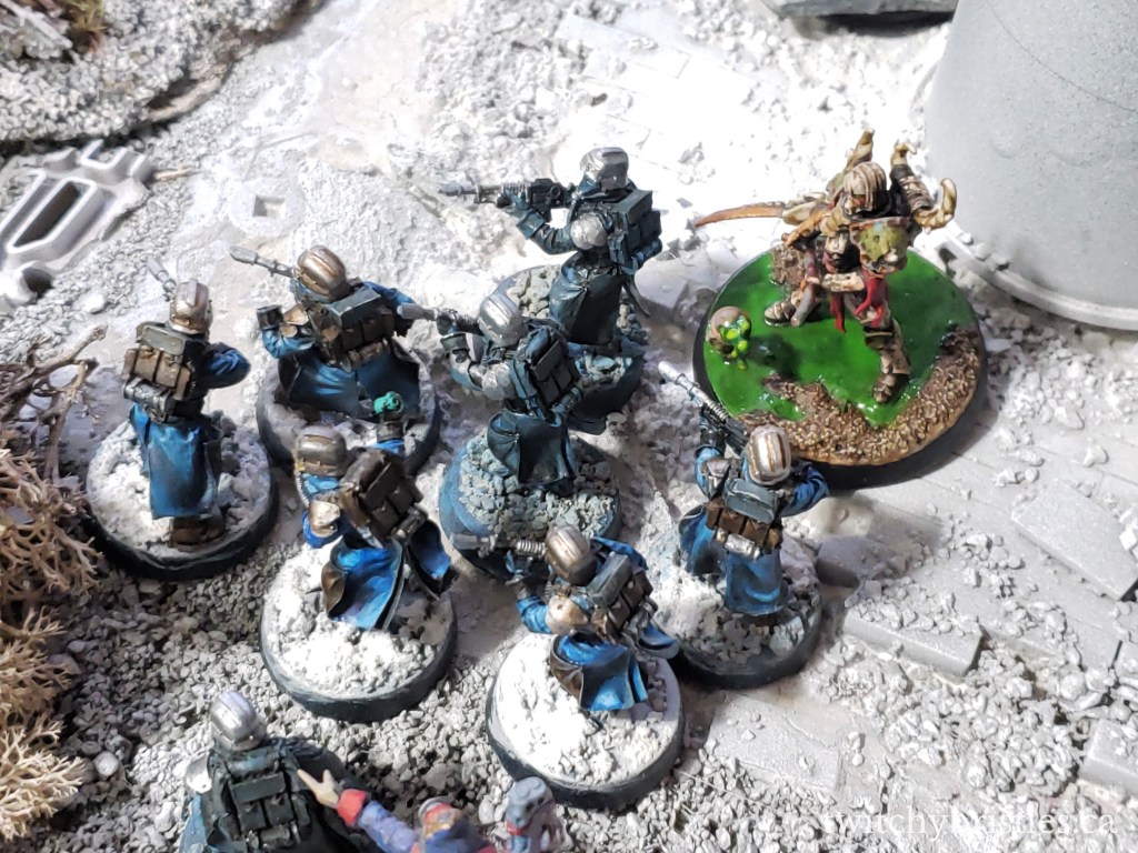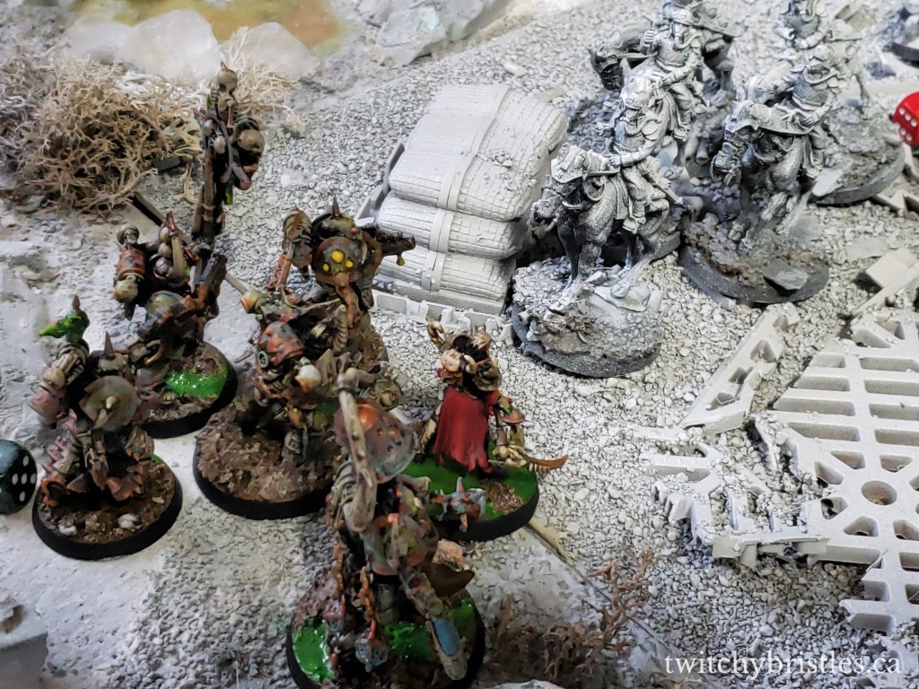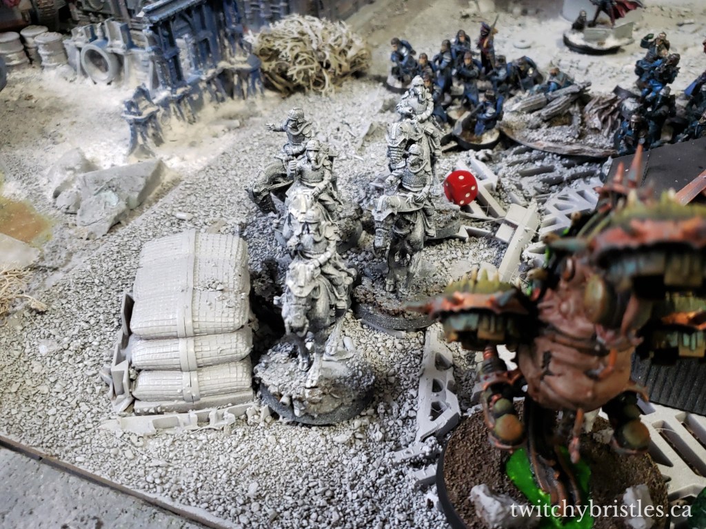 If you’d told me the last time that I’d played Warhammer 40K that it would be six months before I played again, I’d have thought you were crazy. Unfortunately, thanks to a work term during a recent provincial election, and new lockdowns that were only recently lifted in Newfoundland, it was only this past weekend that KinpatsuSamurai and I had a chance to get another battle in for our ongoing Crusade campaign. It was something we’d both looked forward eagerly to – it gave me a chance to test-drive the miniatures I painted over Christmas break, and to try out some of the rules from my new Codex. For KinpatsuSamurai, it gave him a chance to break out his new Death Korps of Krieg army, all of it finished with the exception of the horse boys. The battle was spectacular, and instead of our usual FLGS we played at a table that KinpatsuSamurai set up in his new house.