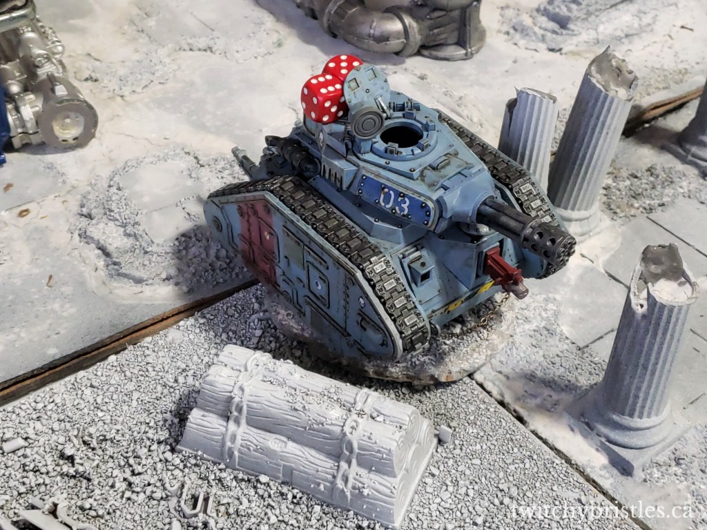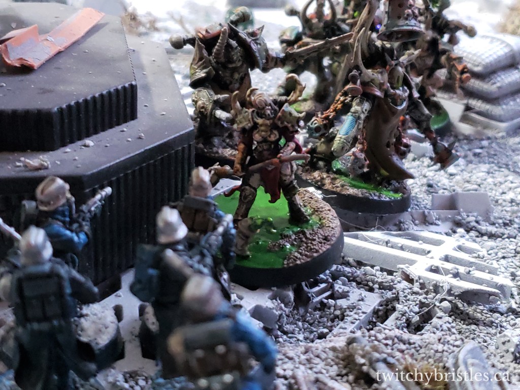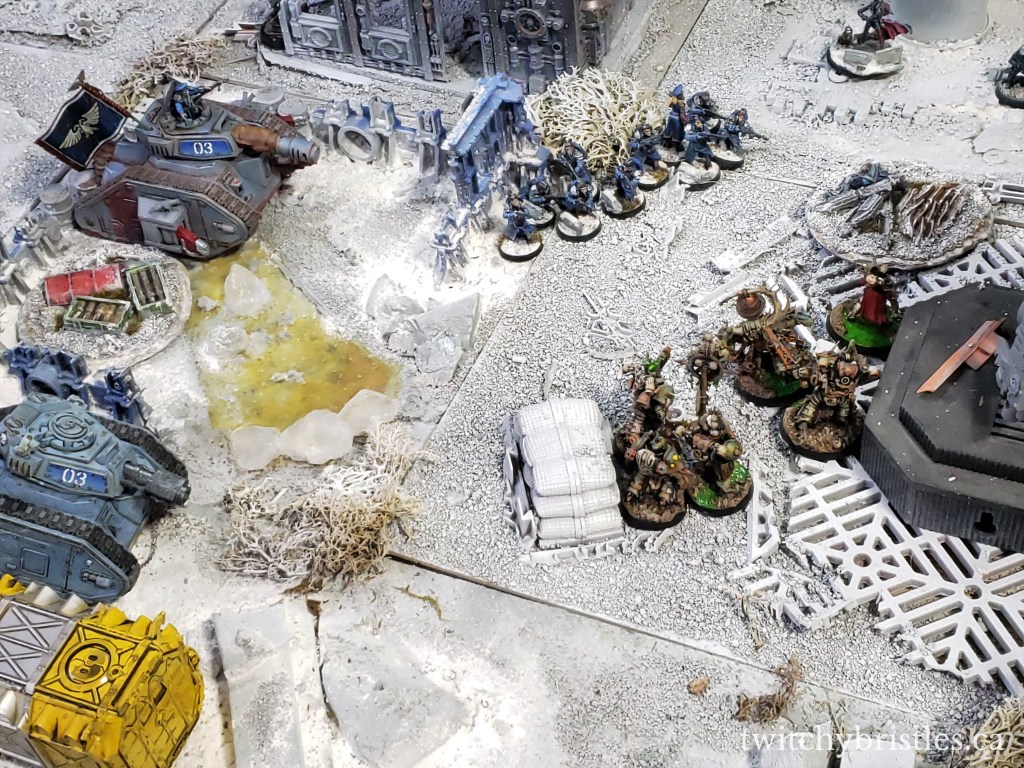 I popped a couple of strategems to try and bombard one of his nearby tanks in the second half of the first turn with the Foul Blightspawn, only for the dice to let me down. The tank involved actually went on to be a pain-point throughout the game, long outliving its welcome and making tons of problems for one half of my Death Guard advance. I hoped to have my Foetid Bloat-drone tie up his horses and troops while the other “half” of my army moved to try and handle his other tanks, including his Warlord, with Blight Launchers, but…regrettably this was not to be. A third of my troops were wiped out in the first turn and I found myself holding even-at-best through the rest of the game, though there were definitely units in my army that made a blight-ridden splash on the tabletop.