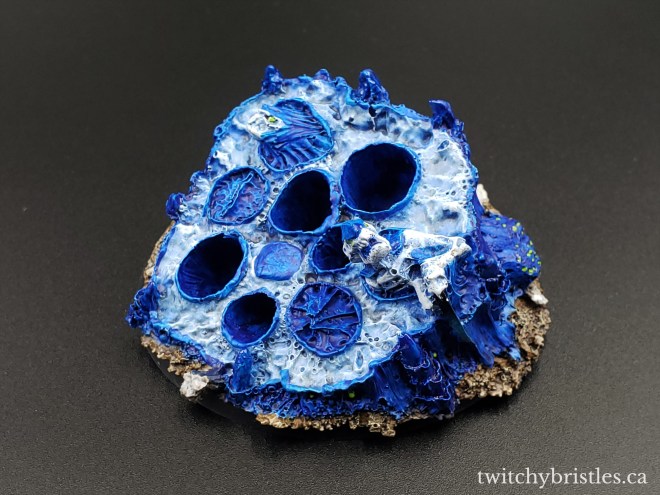 There’s an old expression that if something looks too good to be true, it probably is – and I can’t complain much given that I spent all of $5 on this terrain piece, but I’m almost positive that it was a recast, and it wasn’t a great recast at that. I had to break out the green stuff and reconstruct the jaws of both of the Tyranids and plugged up a whole slew of different holes and flaws in the surface of the chitin and the “meat” of the nest alike, and even then, I found that once I started to paint I noticed even more, less major holes and flaws that I’d have to start over to effectively clean up. Tyranid terrain is so hard to find, though, that I was determined to make this work, and…to be fair, having bubbles in a Tyranid piece just kind of gives it a more organic or porous kind of look, so…it could definitely have been worse.