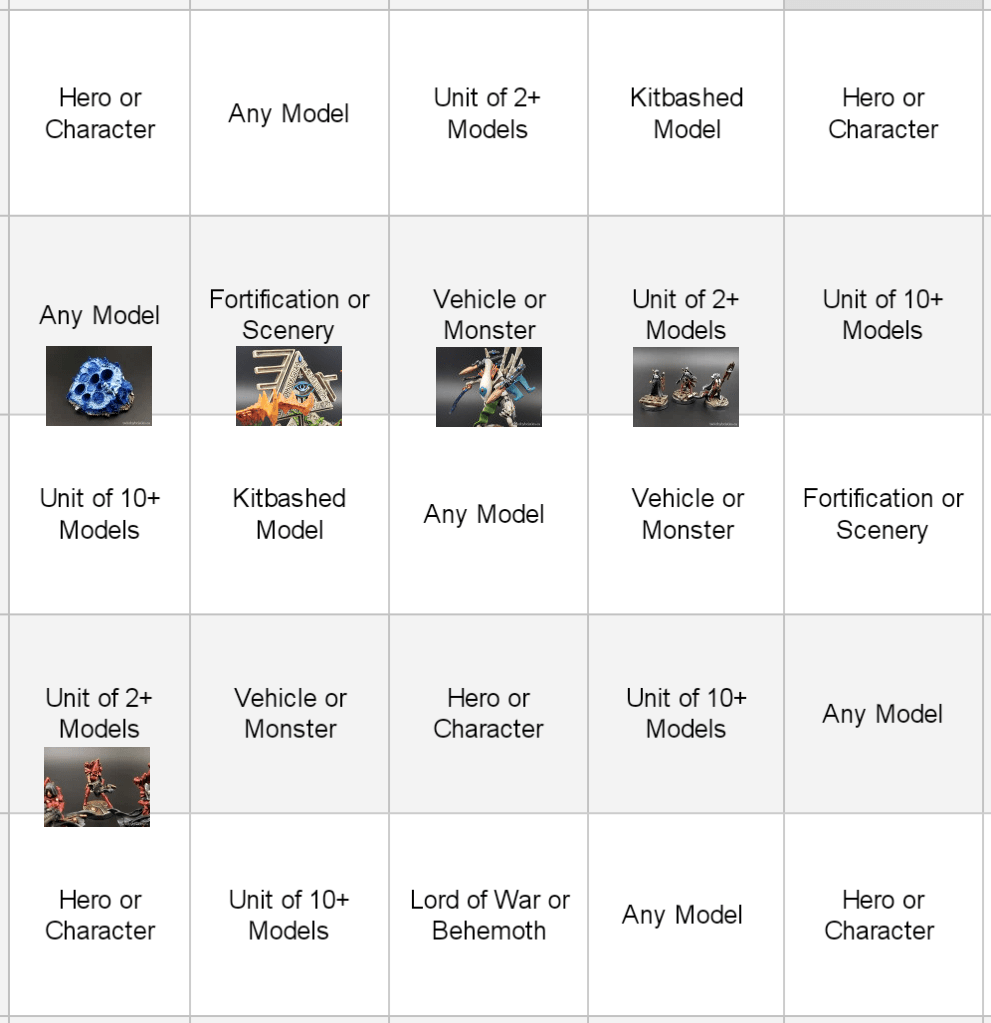 And one last thing before I forget – with my last couple entries, I’ve neglected to update my running “Hobby Bingo” card, so here it is. I felt like this was a little small to count as a whole terrain piece, so I used up one of the “Any Model” spots, and used my last couple Sisters entries to fill up some of the “Unit of 2+ models” categories. Now, I just need to get some units of 10+ models on the go, and I’m all set!