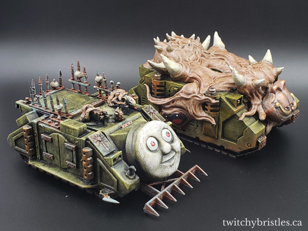 This isn’t my first venture into making a “nightmare fuel” kitbash, but I think this turned out significantly better than the last one. The “Thomas” build that I did was fun and all, but I always felt like the head-to-body ratio was off and I feel like I got that a lot more right with this one. I’m also very happy with how the treads turned out and the fact that the 3D-print sculpt allowed me to add more in the way of grisly or Chaos-y details to the build. This was also another really nice opportunity to practice with a couple of different rust effects, metallic effects, and other techniques.