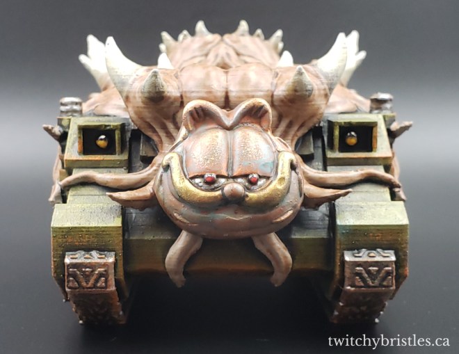 Out of the projects I had lined up on my tray previously, this is probably the one that I was most excited to get to work on. The “base” of the model is a 3D-printed Chaos Rhino (which normally I would link with a shout-out to the seller, but they have recently removed this from their lineup and I don’t want to potentially get them in trouble with the Games Workshop IP police). Attached to that is the dreadful visage of Garfield the cat, which I molded out of Green Stuff and attached to the front.