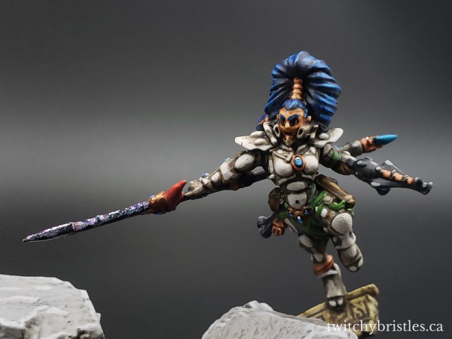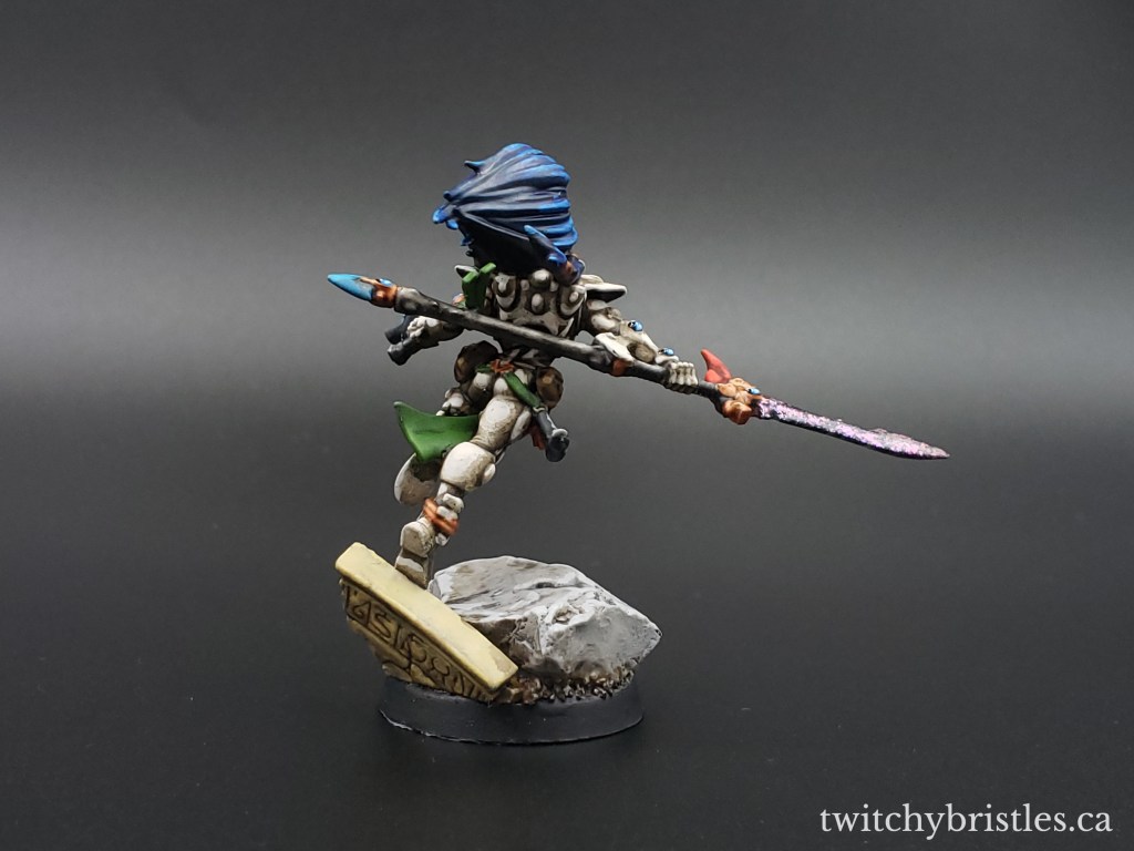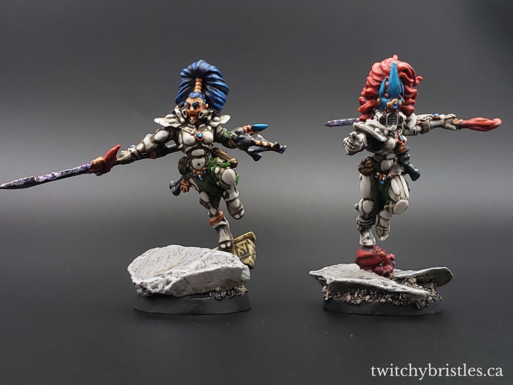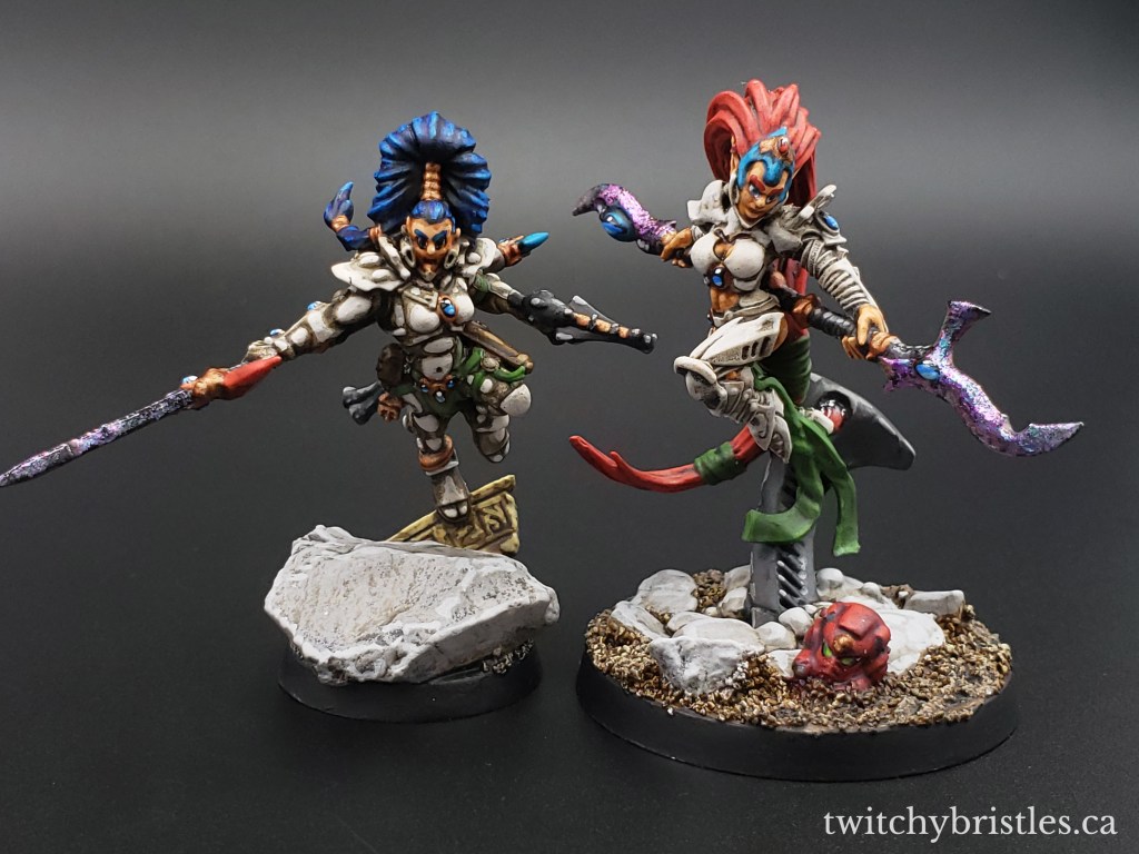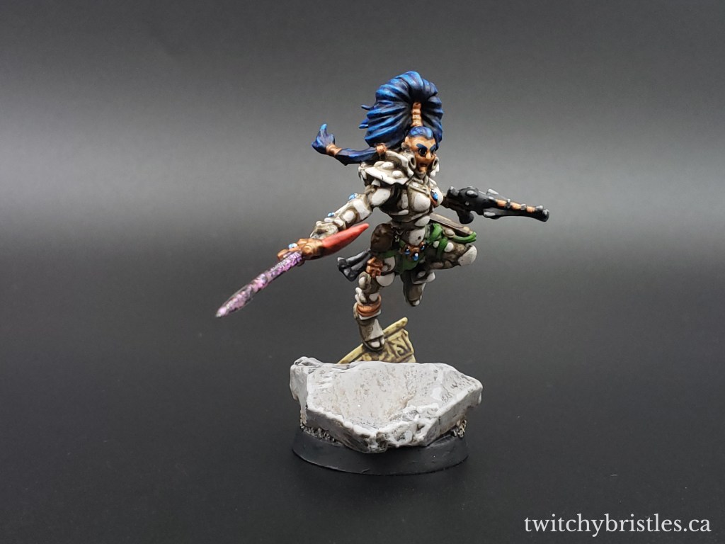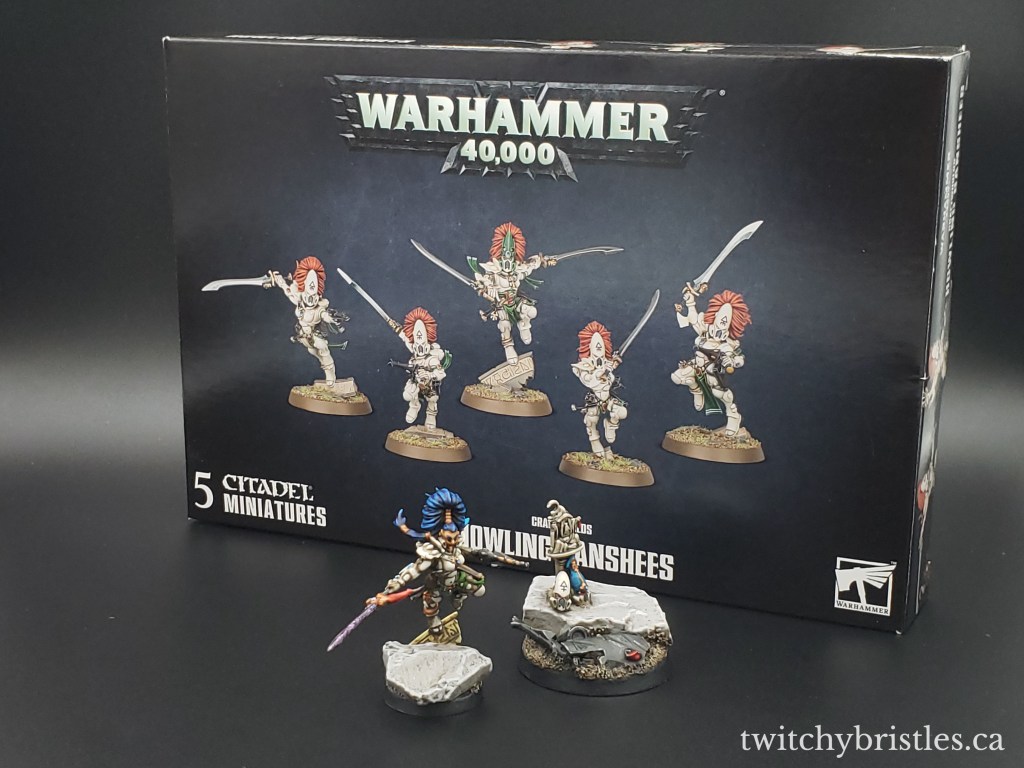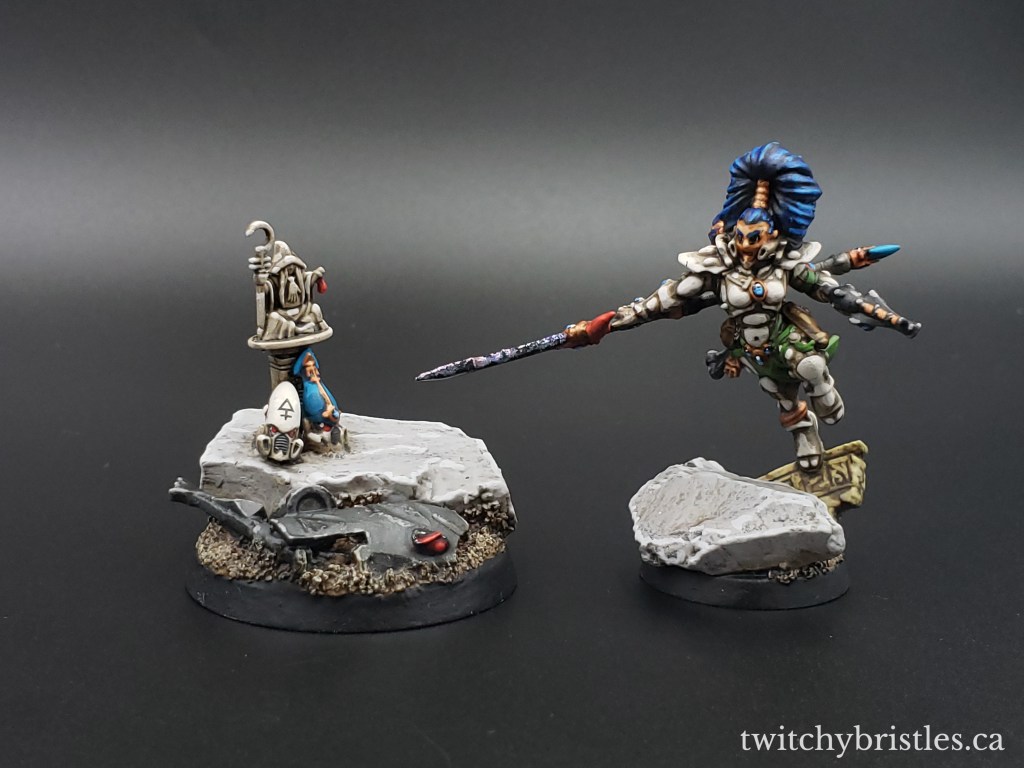 I’m very happy in the end with how Mura (and the shrine as well, of course) turned out, and this makes me feel a little more confident into (eventually) tackling those last four plastic Banshees, if and when I bump Mura’s squad up from 5 to 10. I’m also kind of thrilled that Mura doesn’t suffer from any real size-creep – this Exarch, one of the new plastic Banshees, still scales almost perfectly with the old metal ones. I hadn’t expected that at first, but it’s extremely welcome. I also found that adding a small rock from the driveway into her basing fixed what were otherwise small balance or stability issues, so if you’re building your sword girls and having a hard time, nature is your friend.