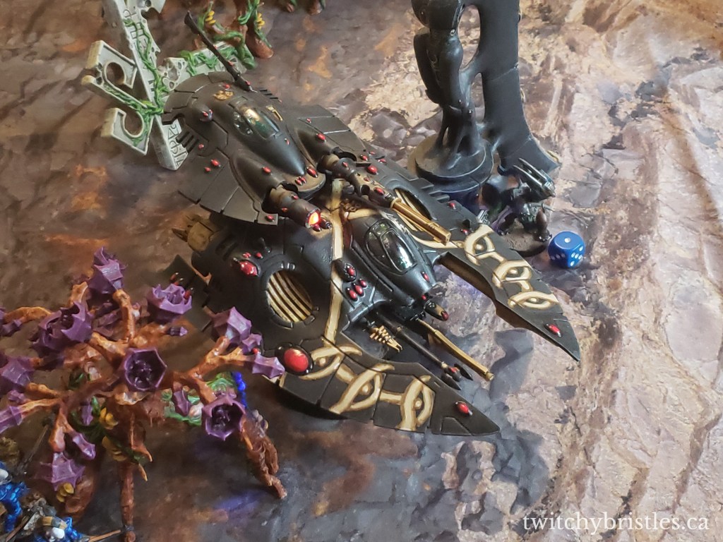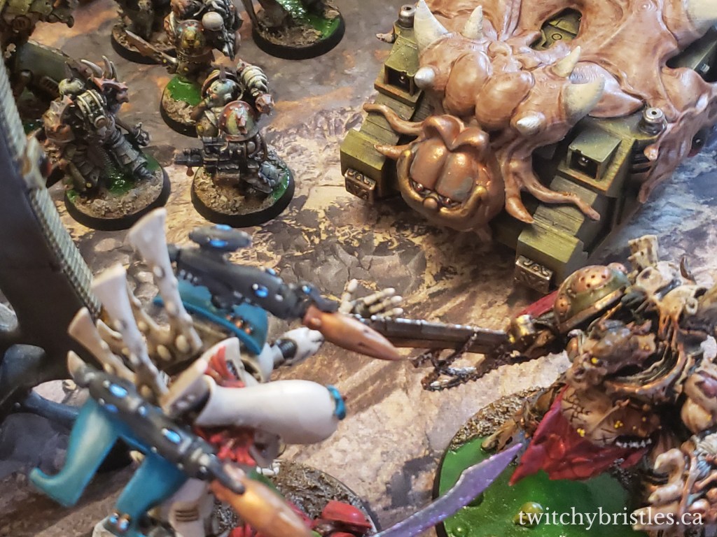 In this “Seed Malignifier” mission from the Plague Purge book, the Eldar and Death Guard were fighting over the wreckage of a couple of Myphitic Blight-Haulers – presumably, the Death Guard wanted to salvage them and the Eldar wanted that not to happen. The Death Guard were ultimately driven back, and with the xp and requisition points gained from this match I might actually stand a fighting chance now against XenonMage’s Tyranids, since this was scored as part of that campaign. She’ll be out visiting next month, and I’m hoping that we can get a game or two in, though her Tyranids might be going up against the Death Guard because I want to see how she deals with Gorefield. But I’m very happy with getting some games in this month, and how the table and terrain turned out!