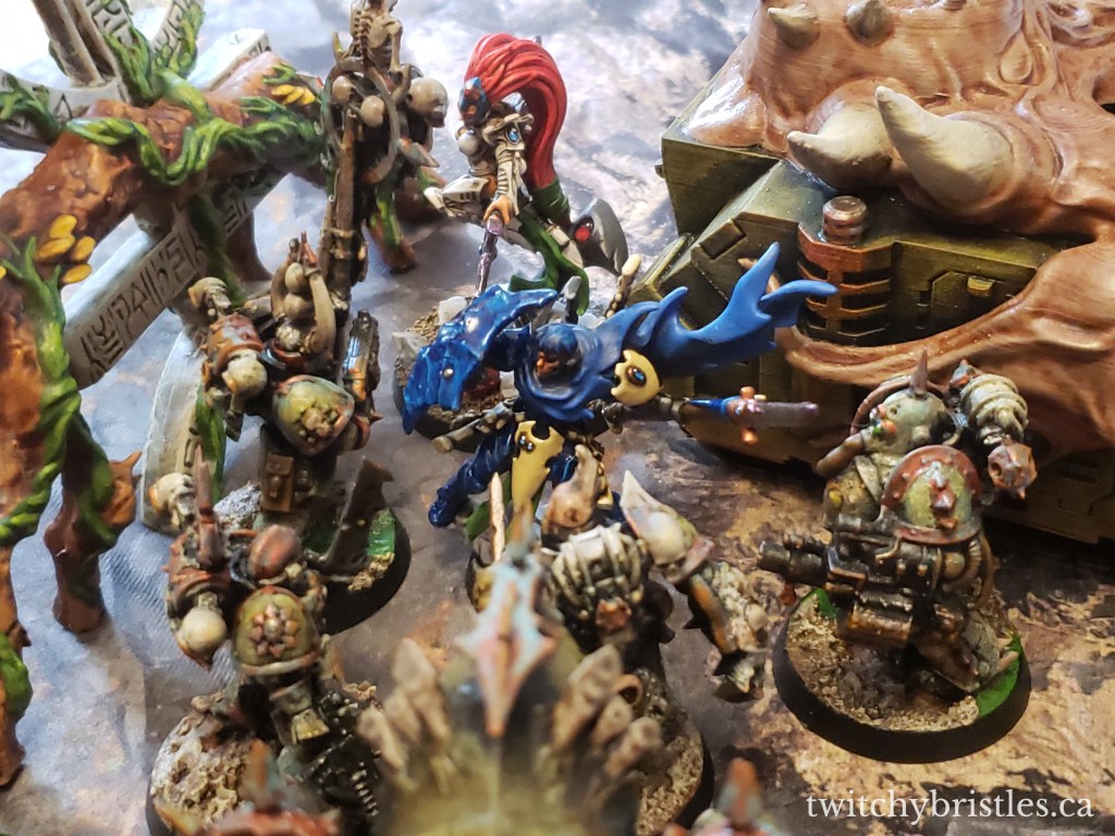 The next game I played on the Deathworld Forest table was more a “practice” game or simulated game than anything else, since frankly I was playing both sides. It was a nice opportunity for some pictures though, and to get a better handle on driving my Death Guard and Eldar, which I’ve definitely struggled a little with lately on both fronts. This time I think I managed a better deployment for my Eldar, and this turned into another wonderfully “swingy” game. While Death Guard initially had a much better position and a much stronger hold on the center, the Eldar bounced back hard, especially thanks to the tag-team of Jain Zar and my Autarch.
