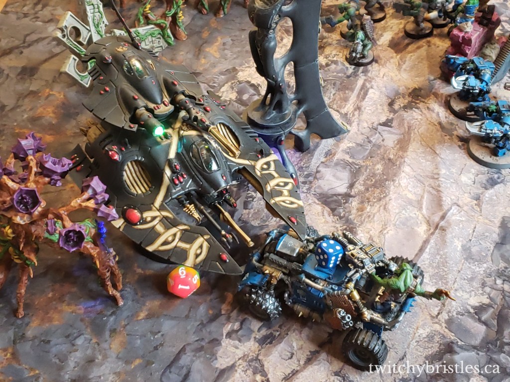 The few Boyz that got through to my Dire Avengers and my Autarch annihilated them. My Falcon, which had been transporting my Howling Banshees into the fray and acting as heavy support, was tied down by a Boomdakka Snazzwagon, which proceeded to curb-stomp the larger and more points-costly vehicle. My Howling Banshees had to deal with the metal Meganobz that Gerard just recently finished, and despite the Eldar’s best efforts, the Meganobz went through them like their armor was made of tissue paper.