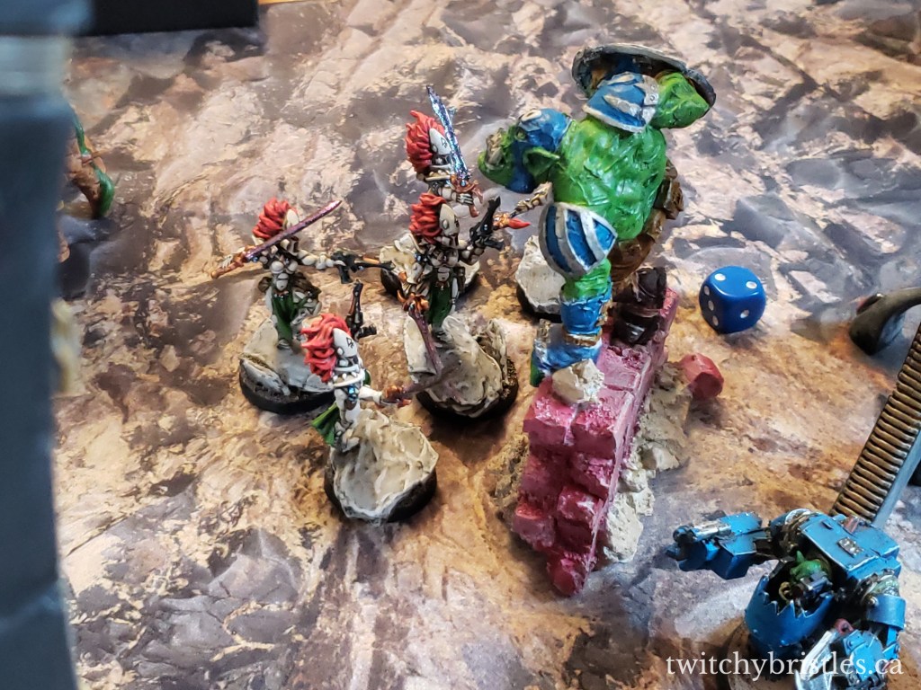 50-0. I had a lead of 50-0 by the time we got to the second turn of the game. I’d shredded through most of his boyz (astutely titled the Cunning Brutes and the Brutal C*nts), and because we were playing an Assassinate 25 PL game from the Core Book, I hit his Warlord, a Weirdboy with a striking resemblance to Captain America, with everything I had. The Warlord finally fell to my Howling Banshees, and I felt pretty confident that I’d have this by the end of the battle round. Boy, was I ever wrong about that.