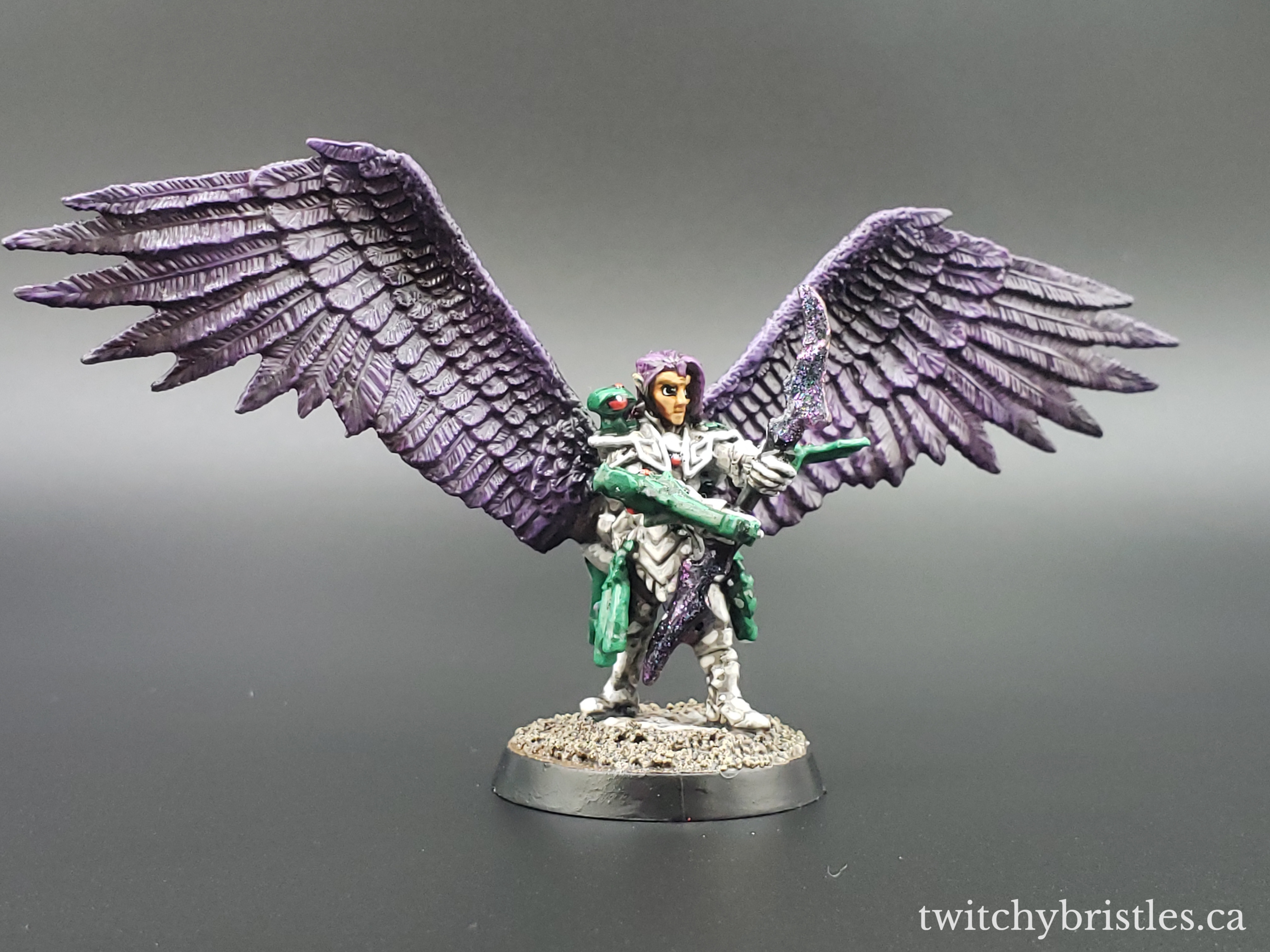 My first miniature painted was the Ilmarin Duskwander (Duskwanderer?) from Reaper Miniatures. It’s an older, metal miniature but it was one that I was using for a long time for a D&D game based on a Legend of Zelda-esque setting that I was GM’ing. When I painted this, back in the day, I knew nothing about miniature painting, technique, or…well, a lot, as you can tell by the old picture that I’ve posted here. To transform this into an Autarch, I wanted to make use of the Faolchu’s Wing relic in the Craftworlds codex to turn this foot-slogging Autarch with a Star Glaive into a living Jojo’s reference with majestic purple locks of hair, and even more majestic wings.
