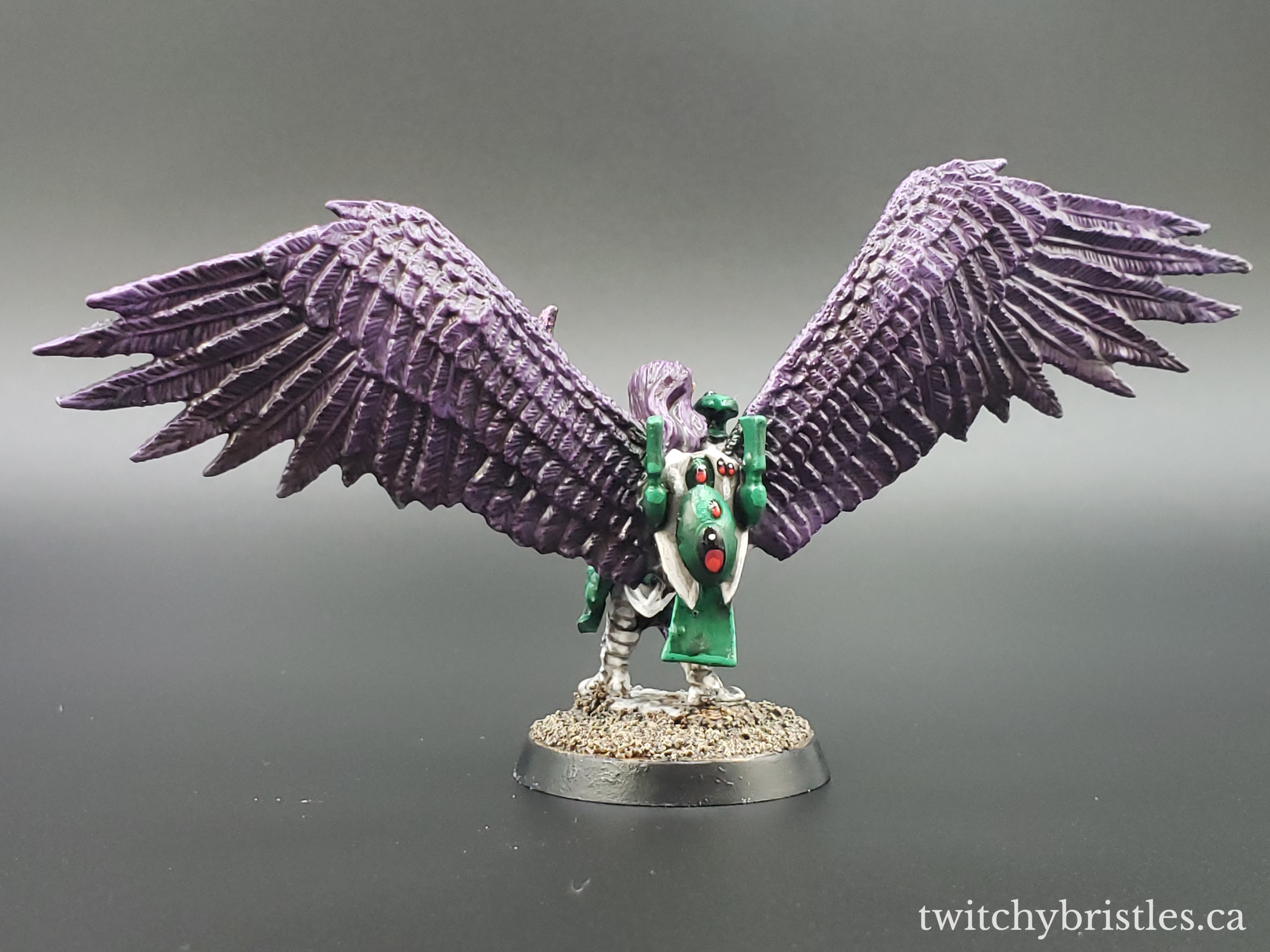 Excellent job on the conversion, Mick! I’d never have guessed what the mini originally was without the “before” photo. The wings and backpack in particular look really good, and the paintjob is a classic Eldar look. Nice work!