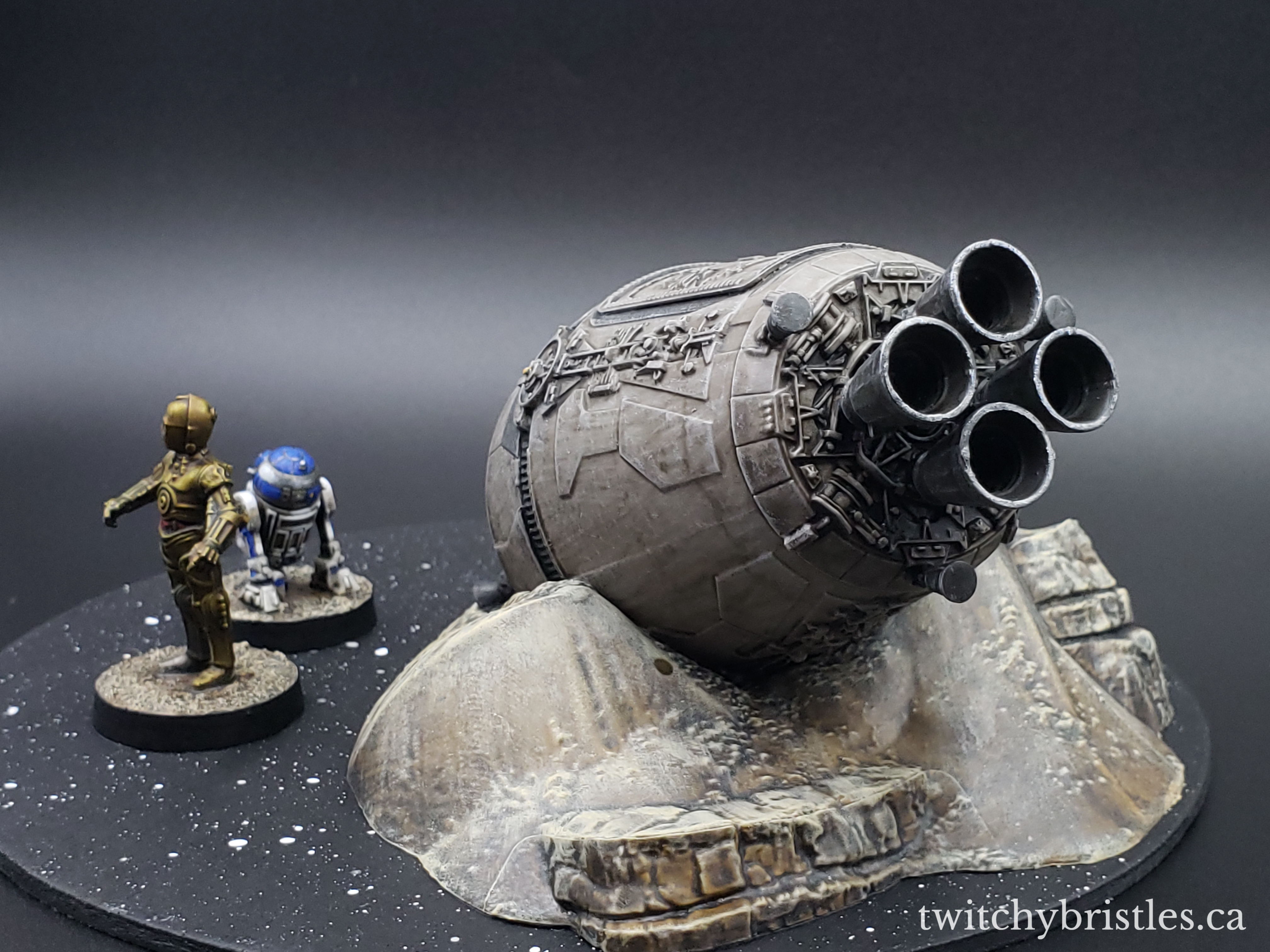 I have some mixed feelings on the results. First, this was definitely a rushed job more than some of my other models and I feel like it shows it, especially when looking at the pod and at the desert “base” of the escape pod itself. That being said, I’m extremely happy with how R2-D2 turned out, and how C-3PO turned out as well, and I feel like with them in the foreground it takes some of the attention off of missteps I made on the terrain.
