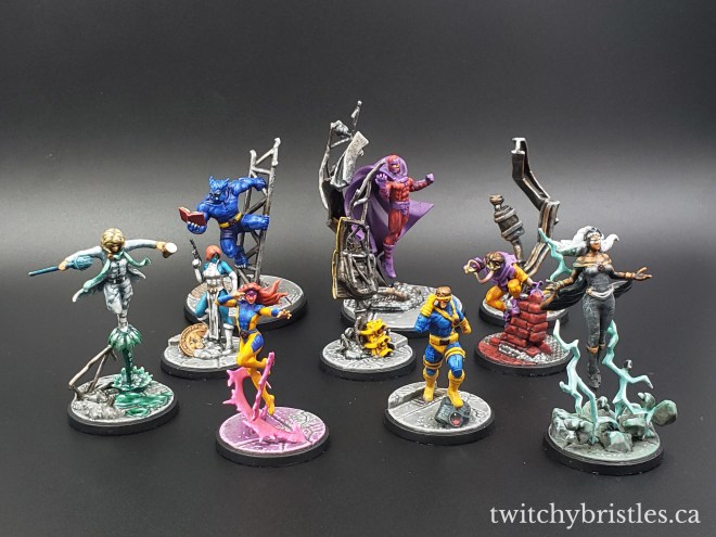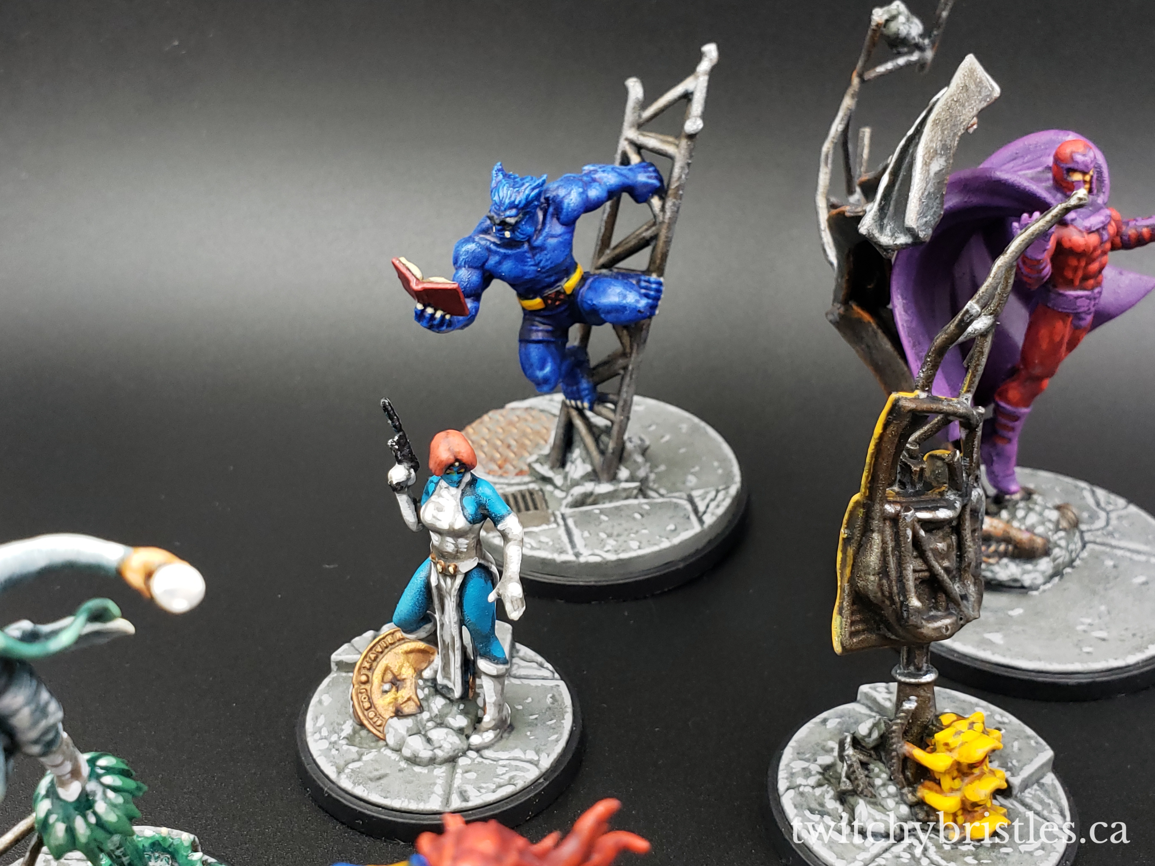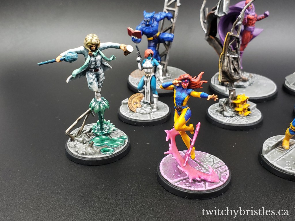 And then I got a little crazy – I liked Mystique’s base but decided I wanted to make it more bold. I liked Cyclops’ terrain feature but decided I needed to patch it a little and make some changes to his hair. Magneto and Toad both got an update in purple, and then everybody got a touch-up and update on their basing except for Storm, who…at least in my humble opinion, wasn’t a model I felt like I should mess with at all further. Out of the bunch I did I think she’s the one that turned out best. And since this is a 10-model count, I can also add this to my hobby Bingo card – because I haven’t given up on that yet!