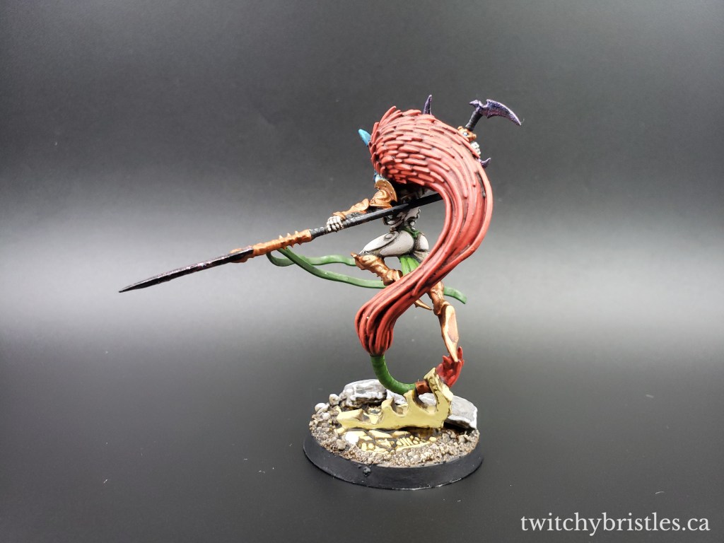 As I’ve also mentioned in the Howling Banshees post from this week, as much as I build these to attach to my Ulthwe army, I find myself seriously considering the idea of running a full Howling-Banshee themed force someday, even if just as a one-off or for giggles. Jain Zar would definitely make for an imposing HQ model for a force like that, and I think that the fact that she grants “ObSec” to Howling Banshees could make that potentially even more silly. I do wish she was a slightly more viable or less costly pick with my Ulthwe army, but I think regardless I’m going to try and make more excuses to bring her along.
