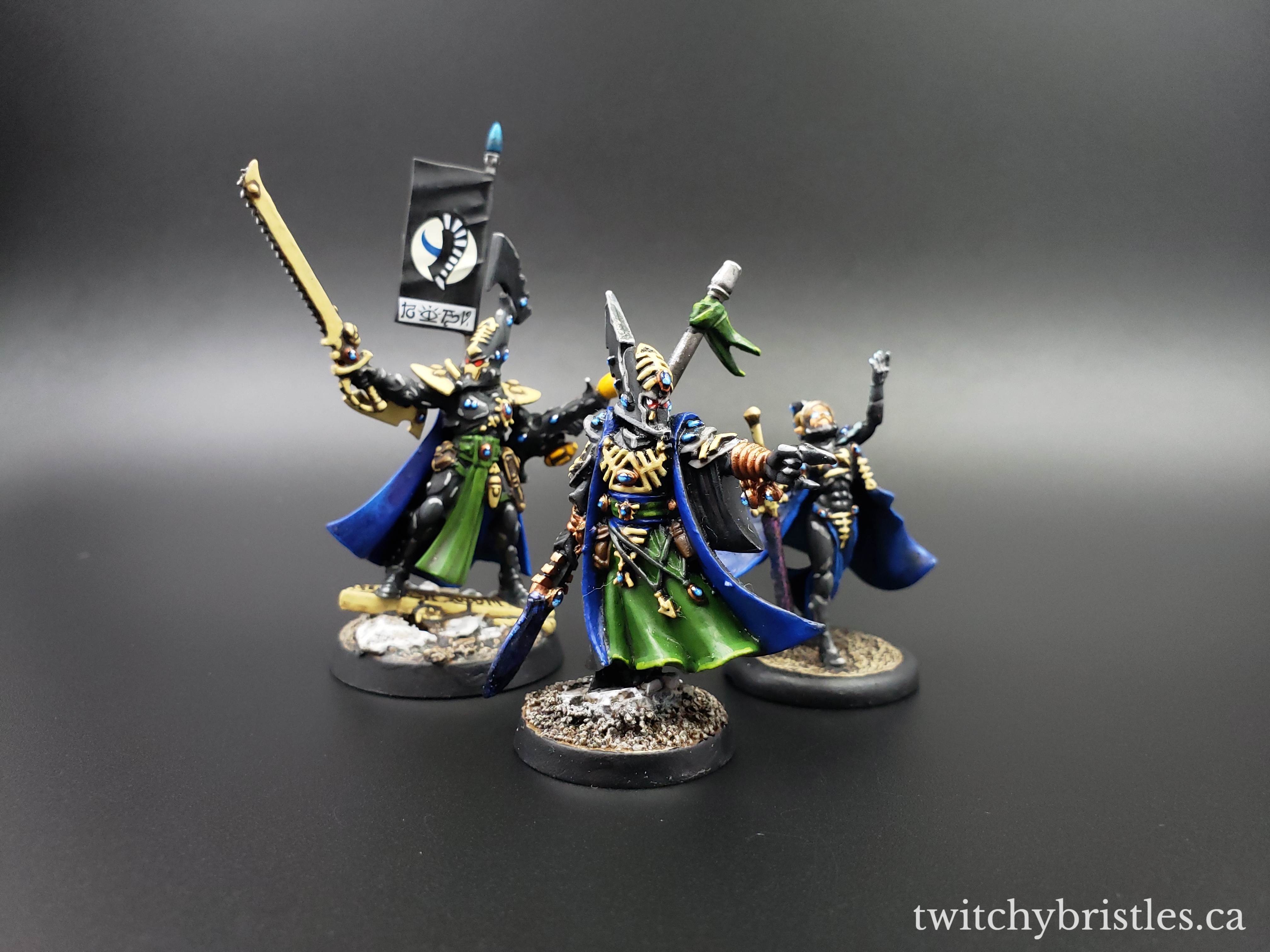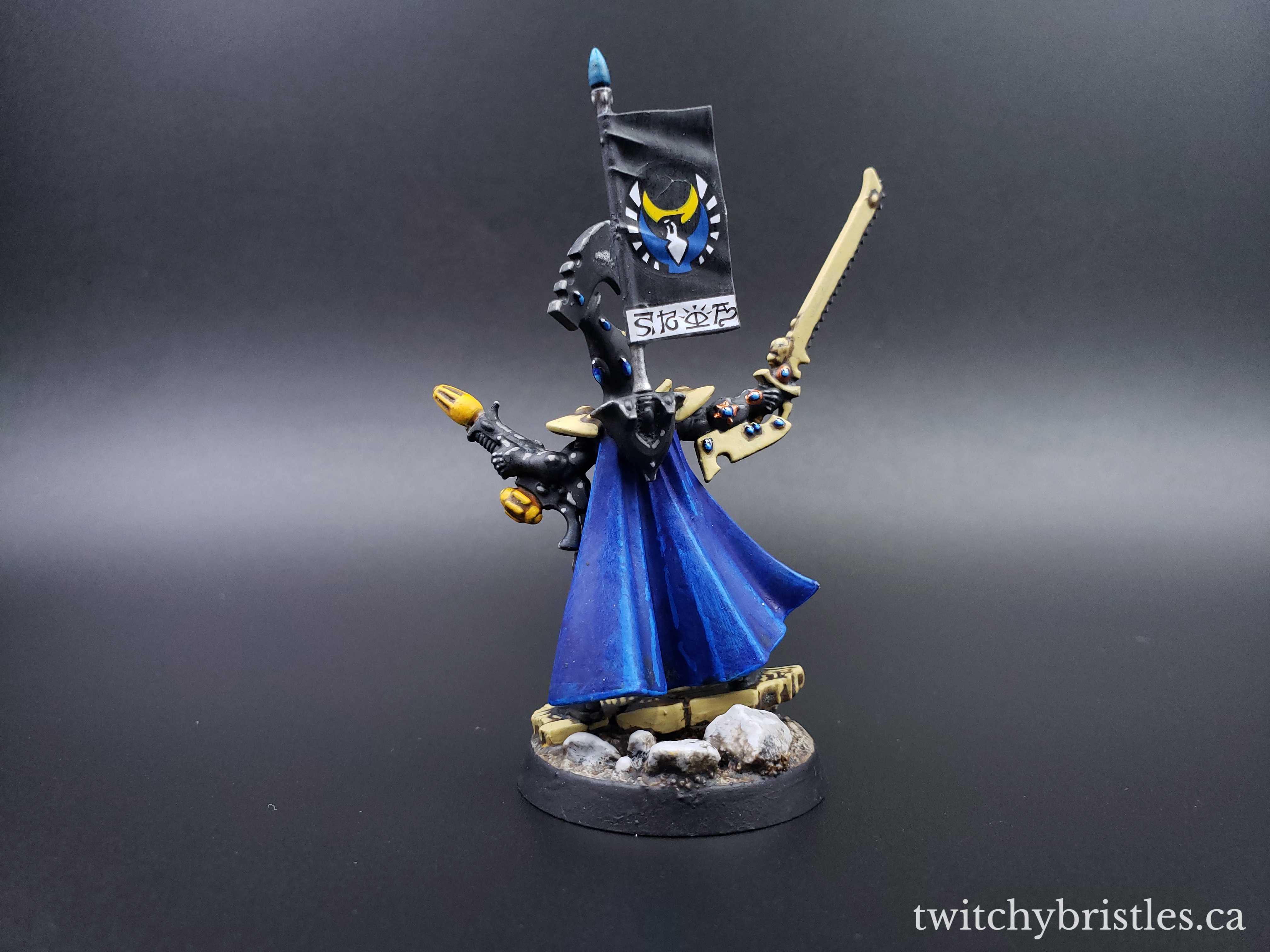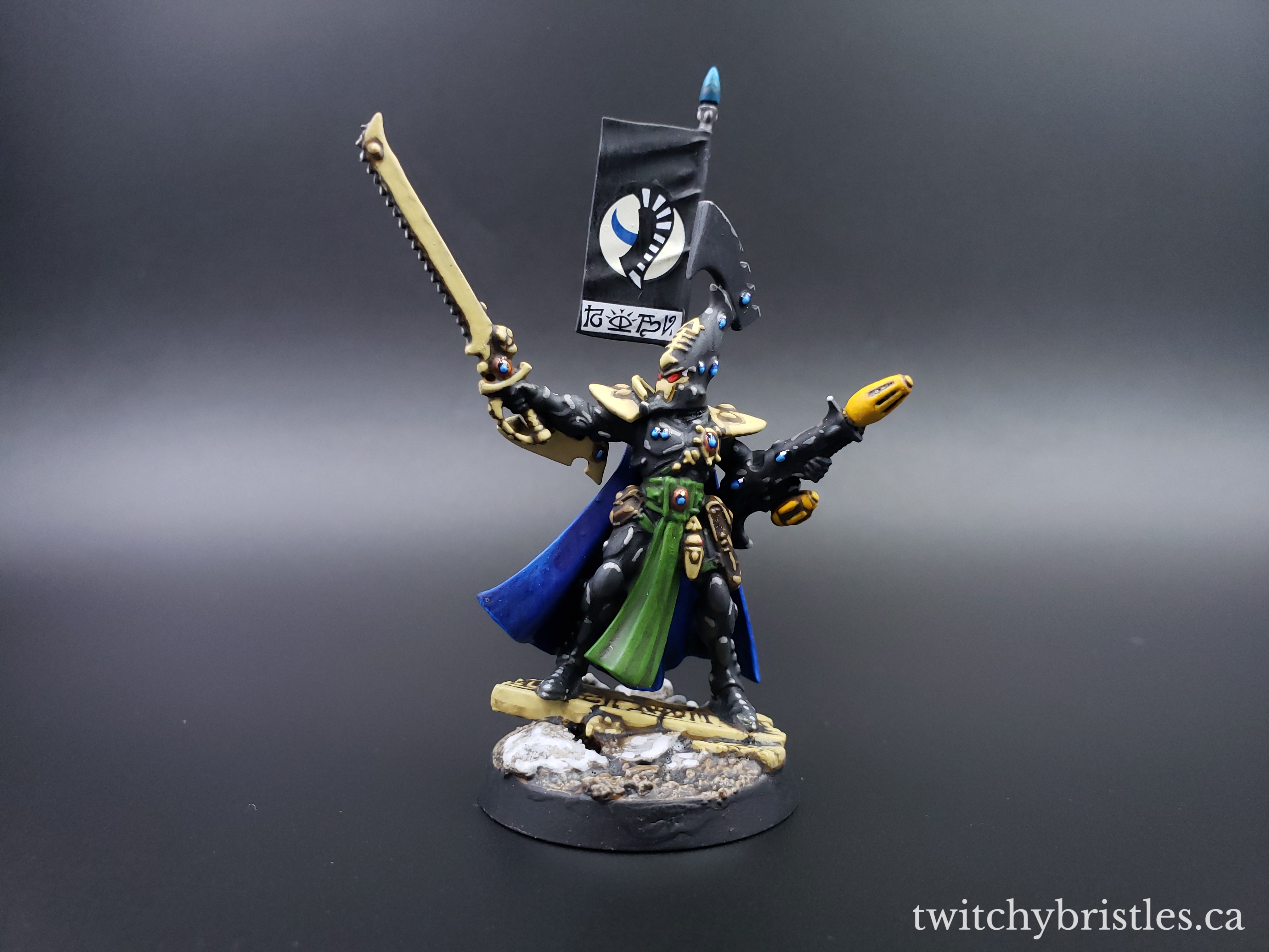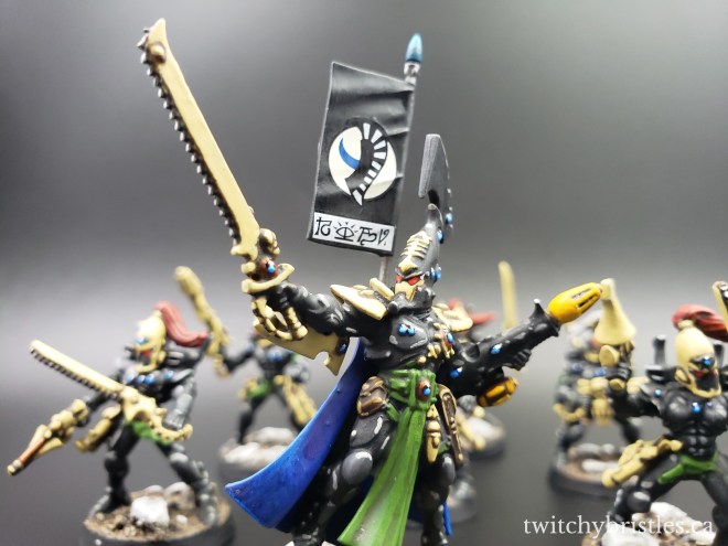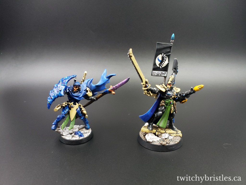 Also, it’s just a very nice kit – went together with no issues, and I found that the surfaces were very accessible, easy to work with, and nicely defined. I mean, yes, I do have my issues with GW but to give credit where it’s due, their Eldar releases recently have really been a case of “Oops, all bangers.” Anyway, after assembly and after picking out how I wanted this guy kitted out I followed what’s largely become my painting formula for Ulthwe, and HQ models in particular – blue capes, green sashes and cloth bits, and then just a whole lot of black and bone colors.