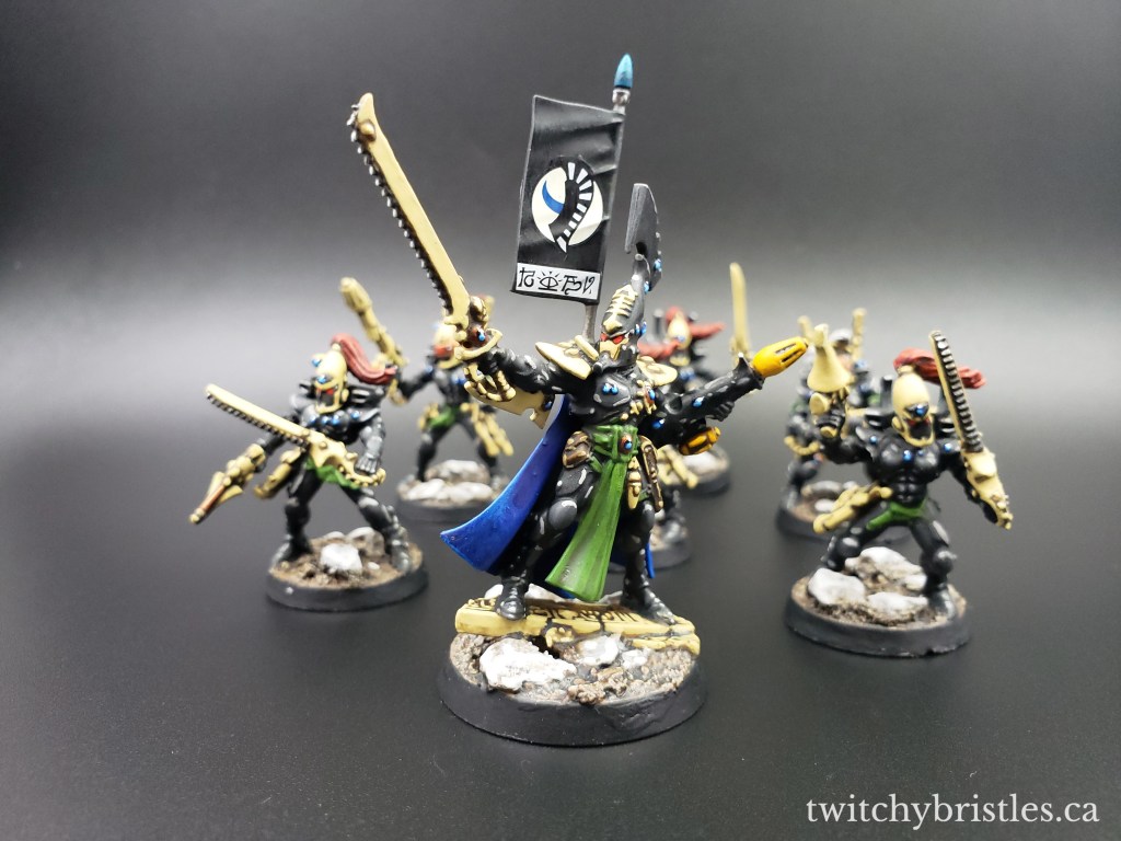 I’m happy with the result – especially on the cape, which somehow I feel like ended up looking more textured and defined than a lot of the other ones I’ve done lately. I’m not even quite sure how I did that, or if I’ll be able to do it again on other projects, but I’ll take the win where I can get it right now. And this makes two out of three of the Eldritch Omens units done, which leaves me with something of a conundrum: do I add the Rangers to my Ulthwe army or show a little bit of love to my Biel-Tan force? I’ll ride with Ulthwe till I die, but those Biel-Tan Rangers, those just hit different.