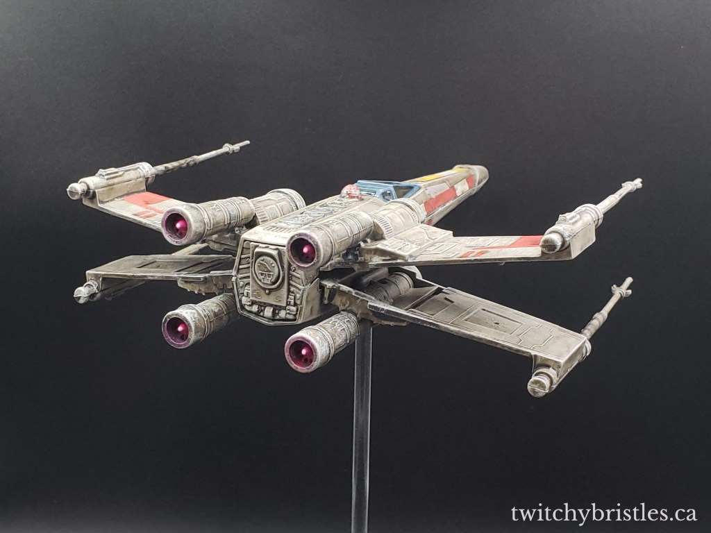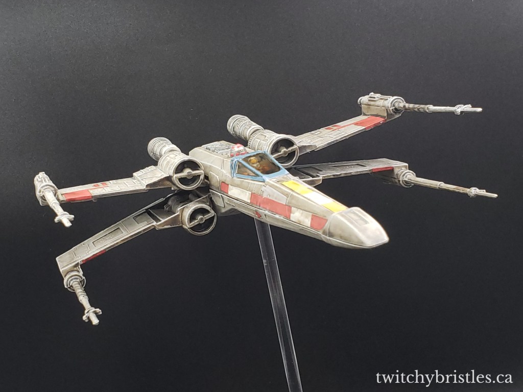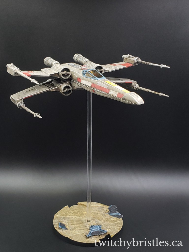 This is, of course, the Round Two kit that was originally from MPC. The kit is old as dirt and is another one of those projects that proves to me how spoiled I am with the quality of plastic and sculpts in modern Warhammer 40K and Star Wars Legion kits. It was a pain to get together but I added an acrylic rod and a base that I picked up ages ago from Troll Trader with some crashed TIE Fighter bits. This ended up being a “less is more” project, which I hadn’t expected at first, since so much of the fuselage and wings were just the same kind of stock grey color. I added little embellishments where I could but painting this kit was a lot easier than building it, in my opinion.