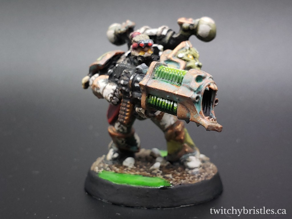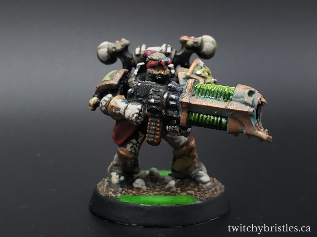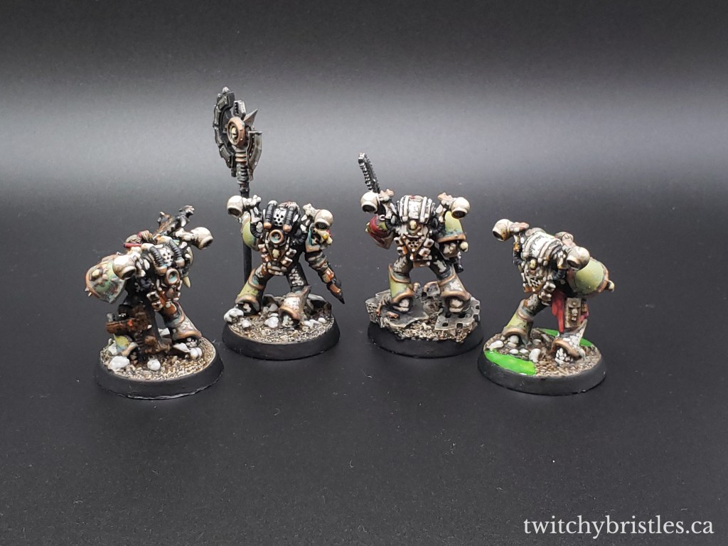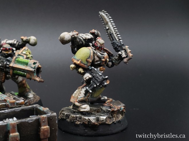These were more or less the same kind of build as the rest of my Plague Sisters – I took an old Chaos marine that Gerard or Kinpatsusamurai had given me, took it apart, and put it back together with some fancy shoulders and heads and new weapons. I also threw in a couple Necromunda crates to make an objective marker since I was painting in the copper colors and with Nihilakh Oxide anyways. And…I think I’m pretty happy with the end result on these, maybe even moreso than some of the first batch of Plague Sisters.