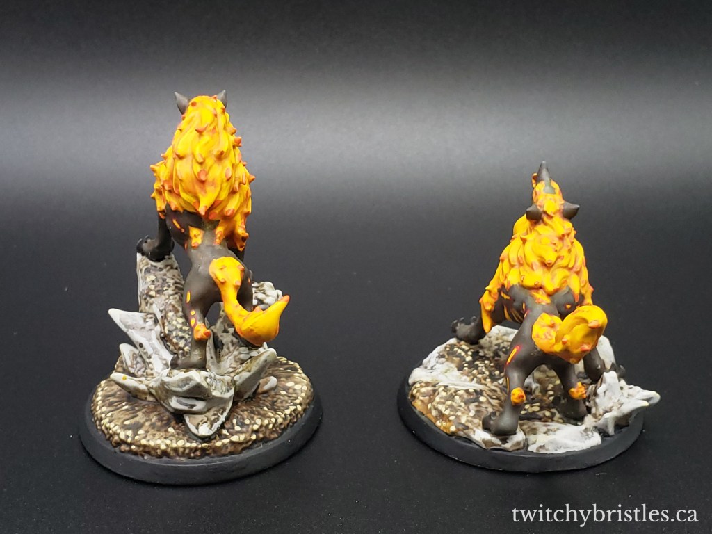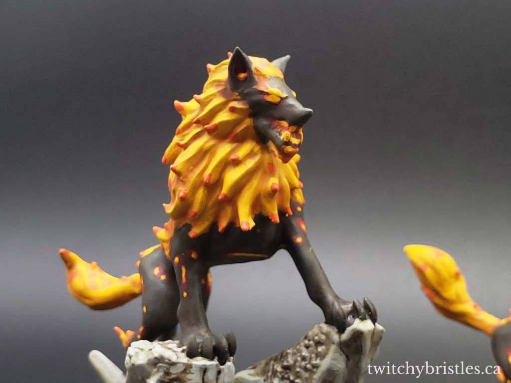 I’ve seen fire effects done in a light-to-dark gradient and a dark-to-light gradient, and decided to go with the former for this attempt, to make it look like heat was basically radiating out from inside the puppers. I feel like I ended up getting a lot of extra paint gummed up on these despite my best efforts, and for once I don’t think I can just blame the varnish, but they’re ultimately a passable model, I think.