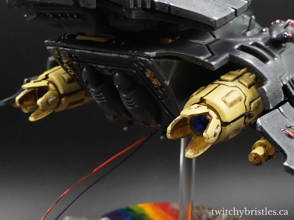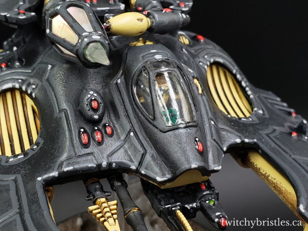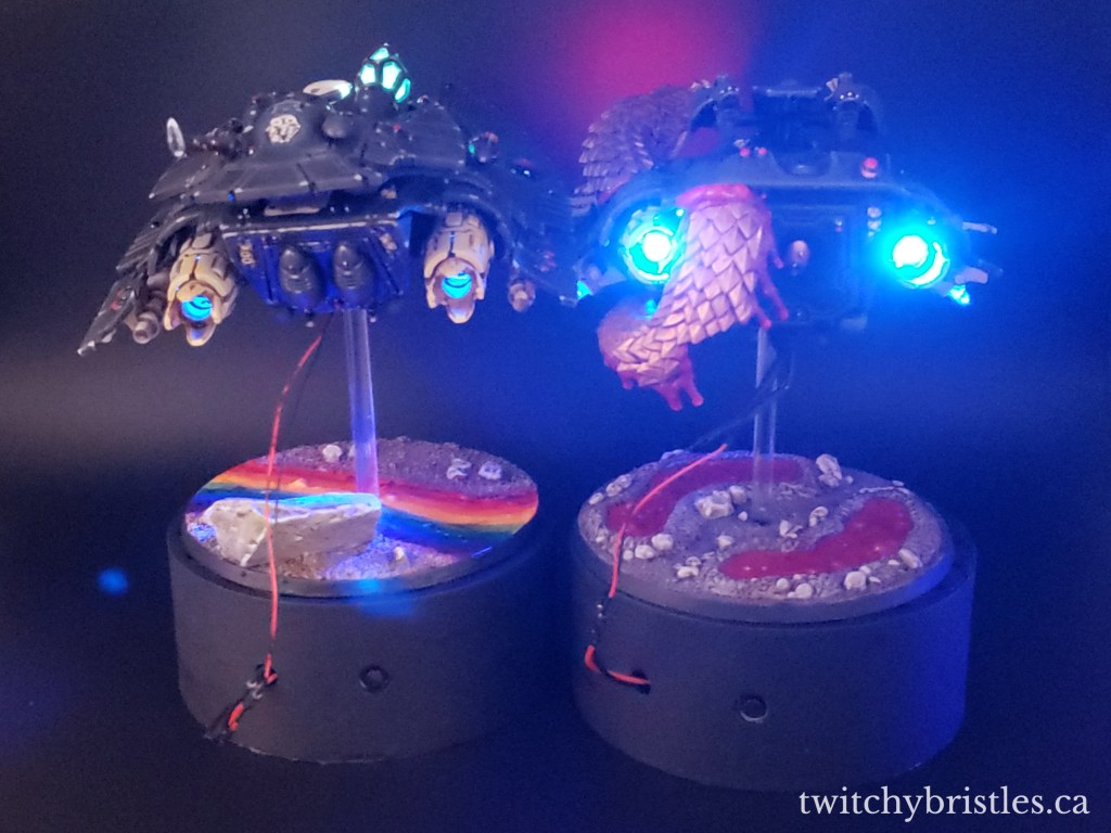 So, when I finally got up the guts to do this, I decided I was going to change a few things. First, while I liked the concept for my original hull patterning, I wanted to let the focus just be on the prism cannon itself, and also I don’t think that in the end the execution of the “eyes” pattern was very good on the original. I wanted to make sure that I took my time with the hull more and did more in the way of edge highlighting, in part so that this would fit in better side-by-side with my Wave Serpent. Last, I decided it was going to need a proper re-basing for its own dedicated battery pack and stand, also like the Wave Serpent.