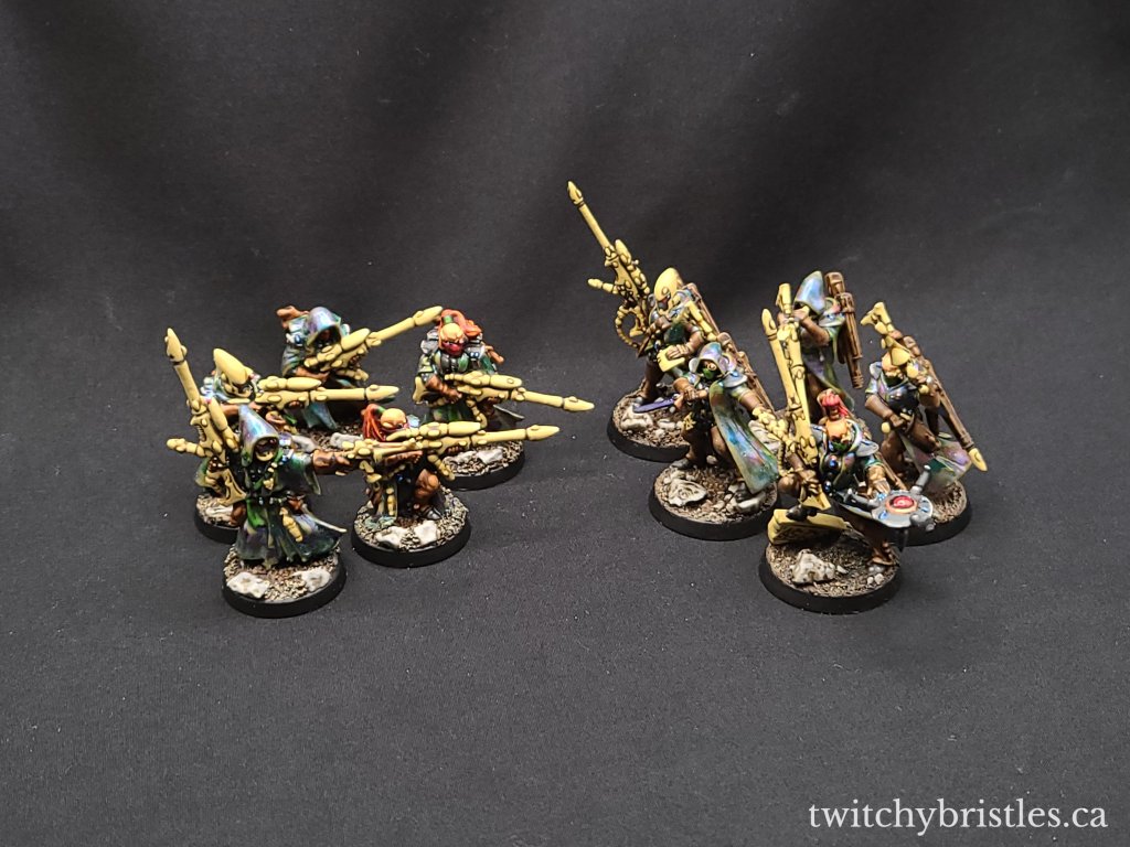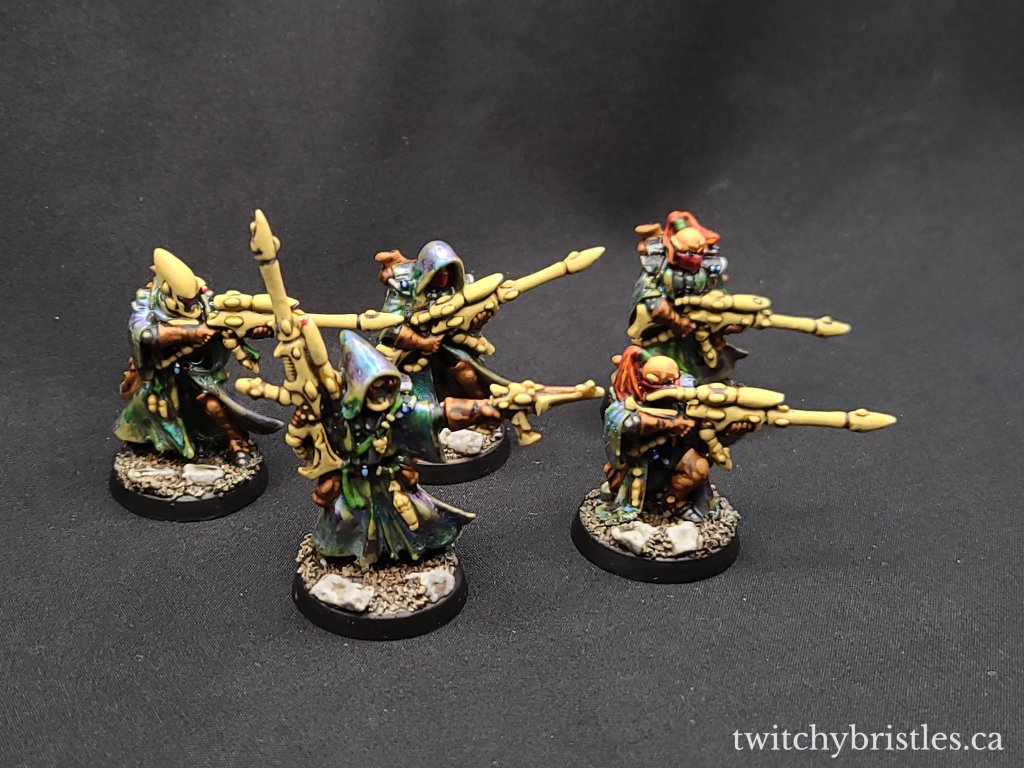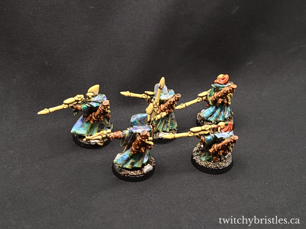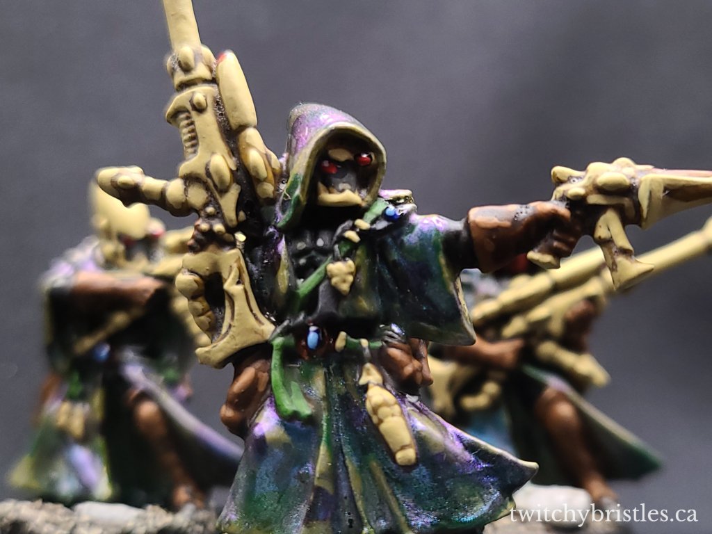 I had a lot of fun with these, especially the cloaks, and I think they fit in really nicely with the other batch. As usually AV / Vallejo shifter paints from the Space Dust set put in most of the work on the cloaks, with a green-to-purple base that became blue-to-purple on edges. I also mixed up the colors for the holsters and leather parts out of necessity, but after seeing the results I might keep the new mix going forward – normally I use Vallejo’s Flat Earth and then just add Buff to taste, but after playing a little with Skrag Brown, washes, and a little bit of Ushabti bone as an option I think I’ve got something that stands out better from the Ulthwe bone tones.