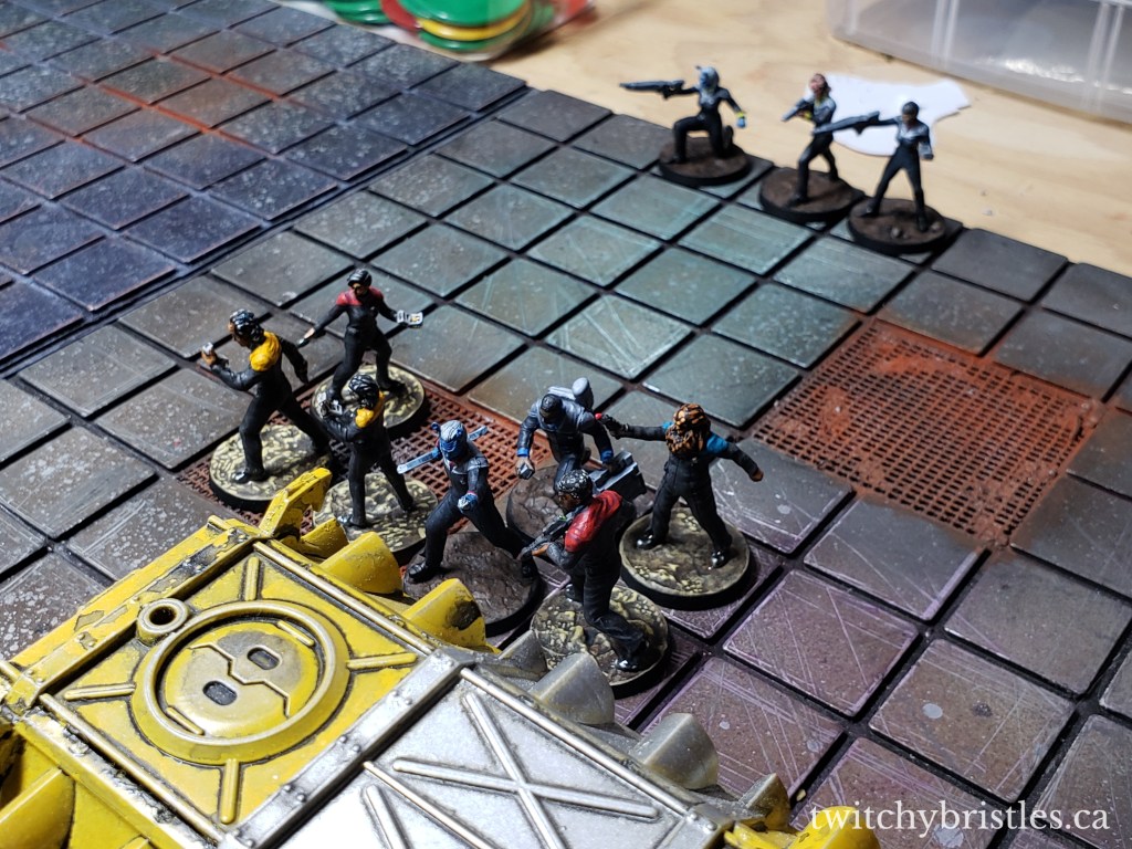 We’ve used Star Trek as a springboard for this campaign but I could absolutely see Warhammer 40K miniatures working in this kind of setting, and I hope that at some point I get to try a run through this game with XenonMage and her Tyranids. (It’ll be like a trust fall but instead of hitting the ground all of my space elves get eaten.) My crew are plucky Lower Decks-esque scientists while KinpatsuSamurai’s team are dedicated soldiers, and we’ve been through some crazy stuff. Tons of environmental hazards, monsters, prison guard robots, collapsing ceilings, and one of my favorite boss fights ever. And so far, we’ve only each lost one of our crew (and they were both wearing red!)