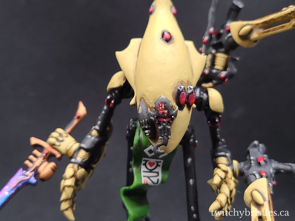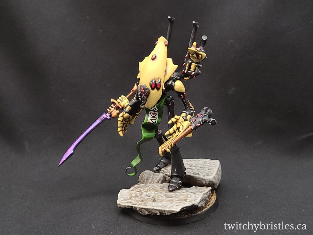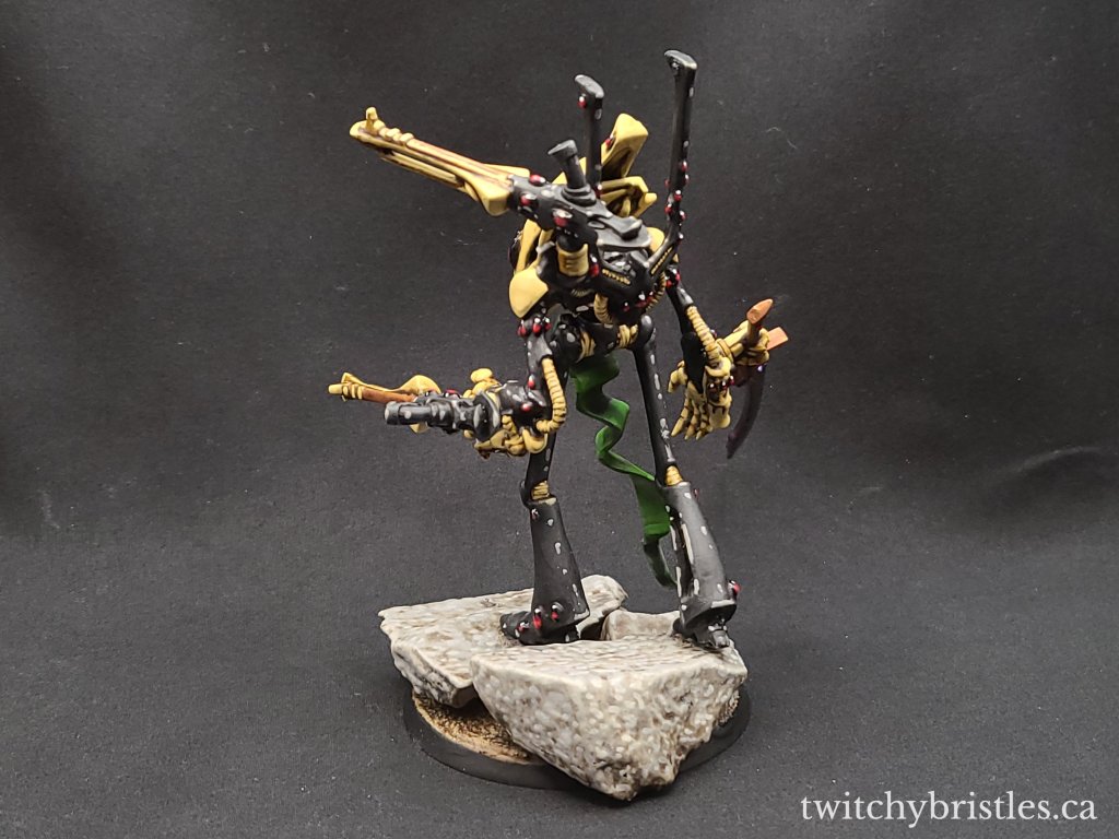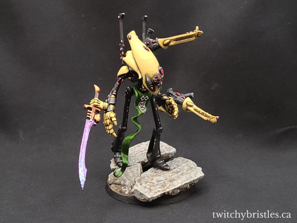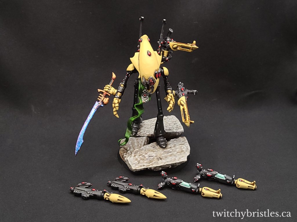 There were two big things I wanted to change with this build of Big Sister – first, I wanted to make sure that she had a Ghostglaive. My “headcanon” or lore for this character was always that she was a former Howling Banshee, because I have picked a lane and it’s Banshees, but the old Wraithlord sculpt didn’t have a melee weapon other than fisticuffs. I took a somewhat lazy but hopefully not too garish option, and just basically magnetized a plastic Wraithlord Ghostglaive, hand and all, and magnetized it to the wrist. If anything I think adding the third hand gives it an eerie, alien look while also keeping Aeldari elegance and aesthetics intact.