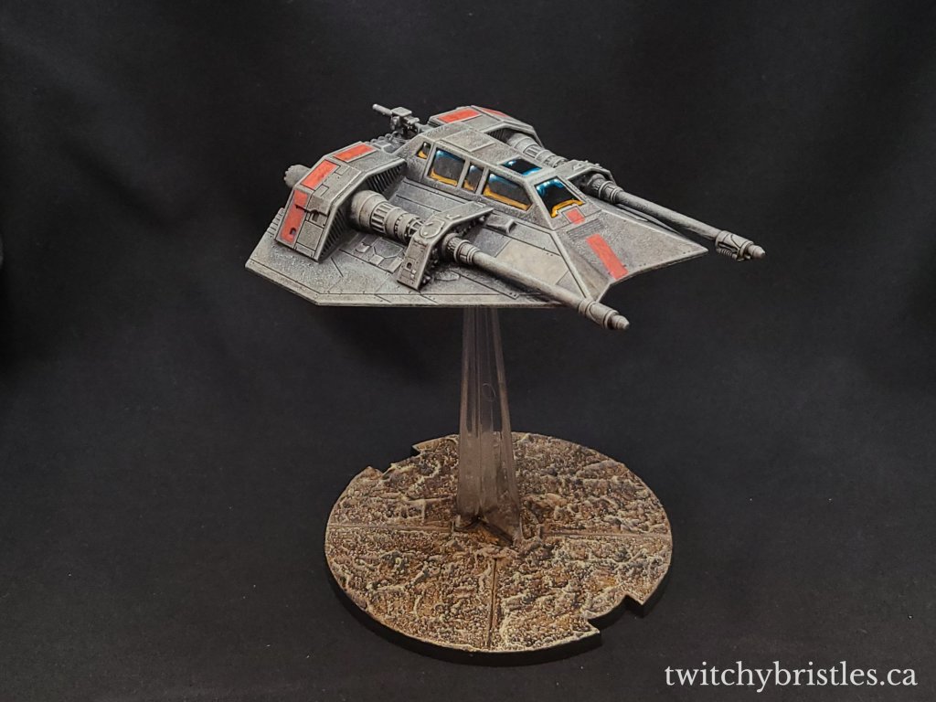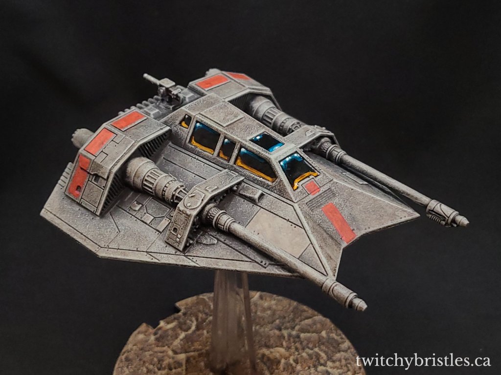 Not unlike the X-Wing, I made heavy use of drybrushing and sponges with a few more precise highlights along the hull to try and make the airspeeder look like I’d put more work into it than I actually did. I stuck mostly to what I’d seen in reference art for the snowspeeder, up to and including the red-orange over the engine covers, and tried to add some silvery or lighter surfaces to mix up the look of the gray while I splashed on washes and stuff to make it all look subtle. In the end, it was a quick dirty project but also a very fun little speedpaint.