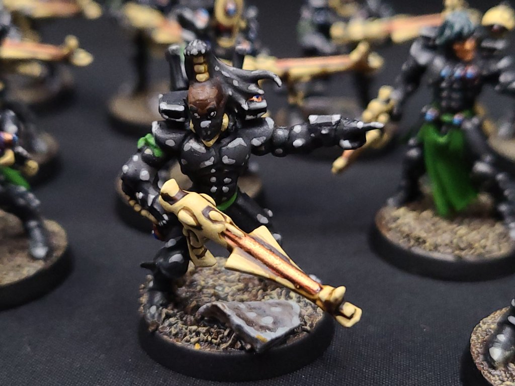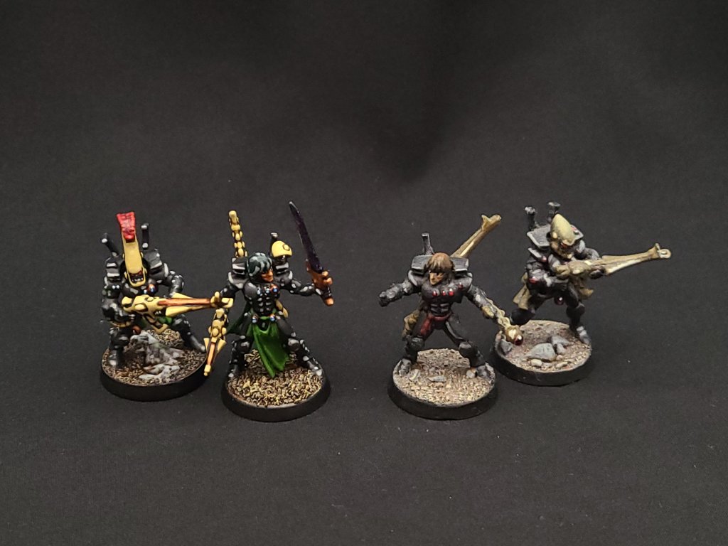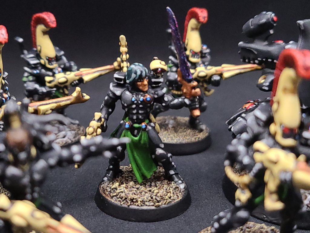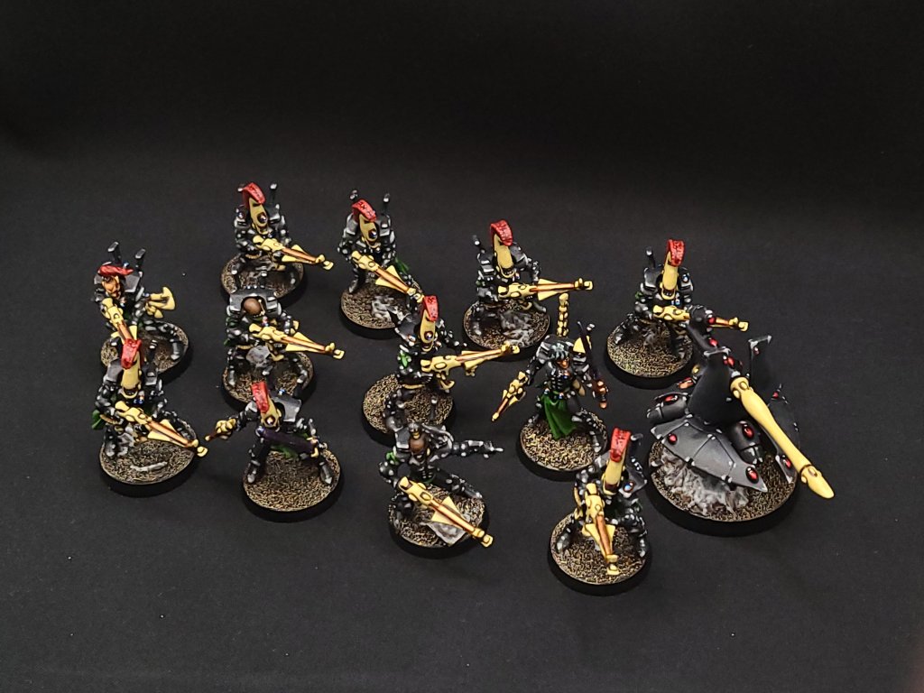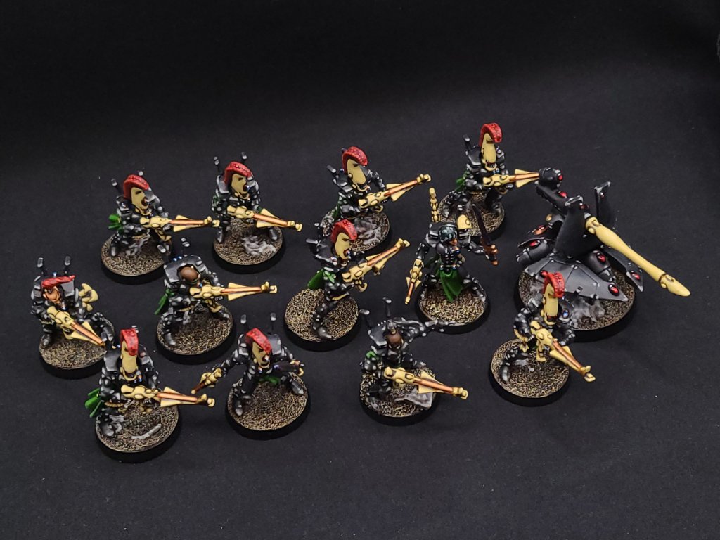 These ended up following my usual Guardian / Storm Guardian recipe, with a couple of cues taken from previous times I’ve done Banshees or Dire Avengers. (If you really want to get technical about it, my paint scheme comes from an old Shrine of the Ebon Blade design for Ulthwe’s Howling Banshees, so I guess the whole army is technically a Banshee army.) I mixed in a bunch of bits from more recent kits and all of the metal Dire Avenger bits, so that they’ve got the weight and character of old metal models but also still have a good amount of detail and flavor that blends them in with more recent stuff.