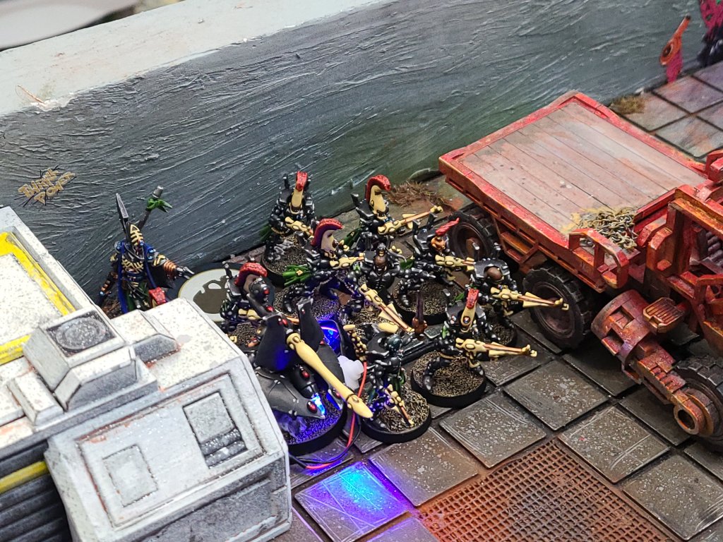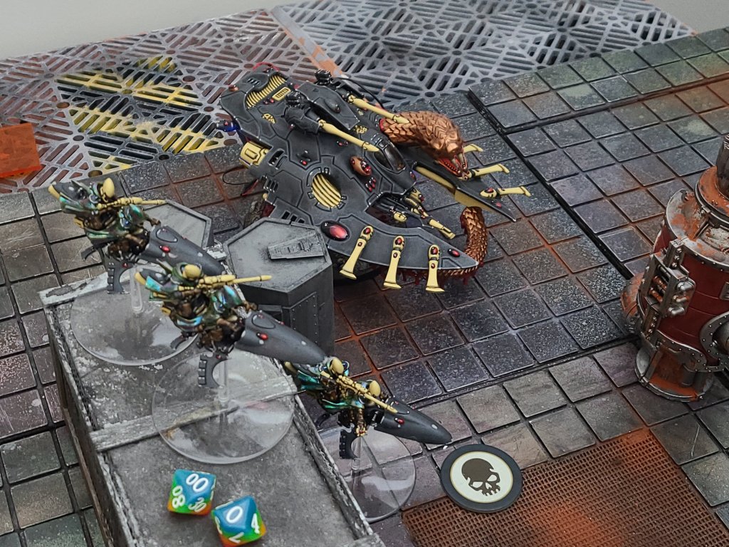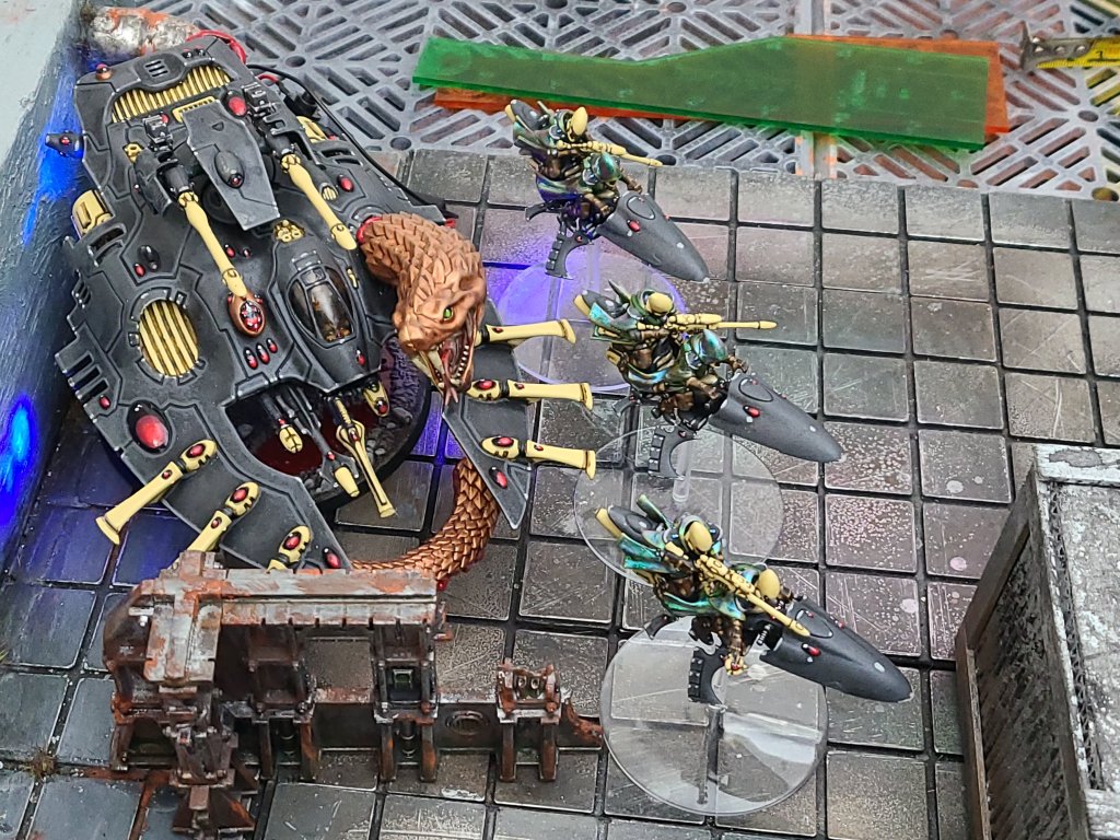 Unfortunately, that wasn’t quite enough to cinch a win, and I can’t even be mad about that. I had my Wave Serpent too far out of reach of his infantry this time, and his deployment with some very sneaky, sneaky dreadnoughts made it very difficult for my heavy weapons to line up a shot. I think I’m also learning which parts of 10th are going to be an obstacle for me – the consistent cover that enemies seem to get if they’re partially obscured being the foremost among them. There might be a Vyper jetbike in my future, to make my Shroud Runners just a little more effective at landing hits, since the Scatter Lasers’ lack of AP is really smarting so far. All in all, two very fun matches, and lots of good lessons learned that I can take into my next few games.