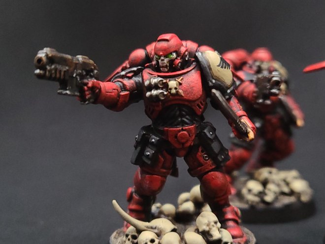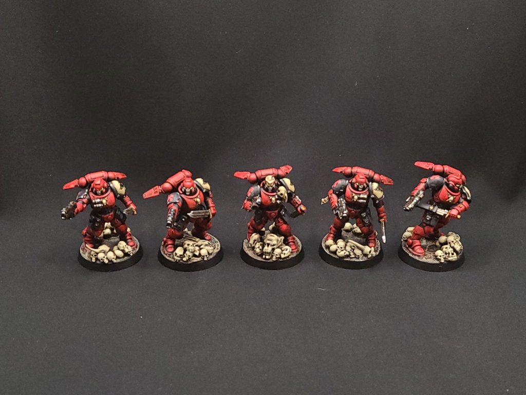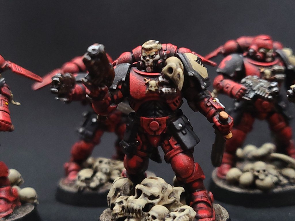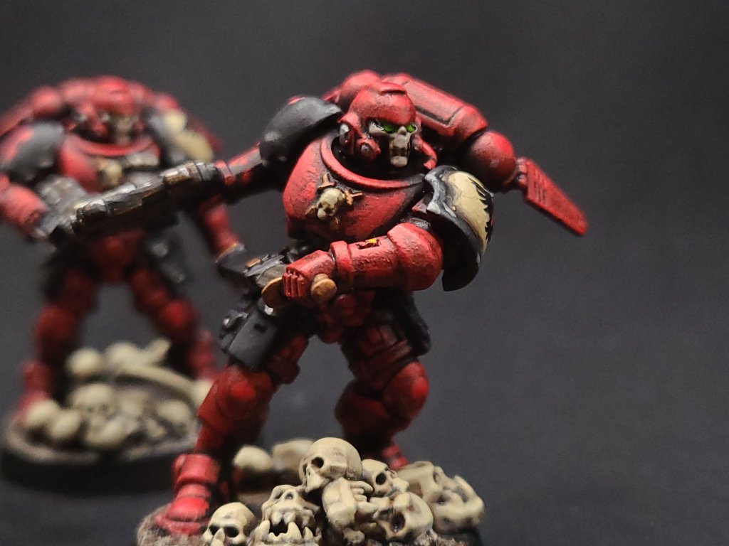 I went with the scheme I’d played with on the corrupted Blood Raven captain and the Phobos Lieutenant I painted recently, starting with sponging and then moving on to a little bit of edge highlighting to get the reds to pop nicely before moving into the bone colors, metallics, and everything else. It seems to be a pretty good system and I’m looking forward to seeing how it translates down the road onto a larger model like maybe a Dreadnought or a Repulsor for terrain or flavor purposes. I don’t see this necessarily turning into a full-fledged army, but I want these guys to have at least some toys to play with.