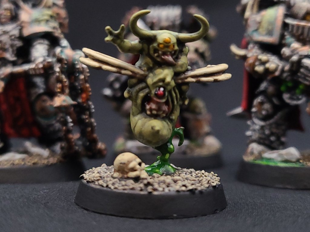 And, of course, in order to be verifiably Plague Marines, beyond shadow of any reasonable doubt, these gals needed a Nurgling, and Grandfather Nurgle provided. I was lucky enough to get this in a batch of bulk Chaos bits and I’ve been looking for the right excuse to paint him up and let him go. Between these and the ETB marines I recently repainted, my Death Guard battleline is getting a boost and I couldn’t be happier.