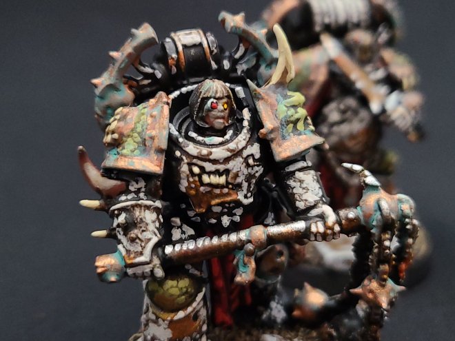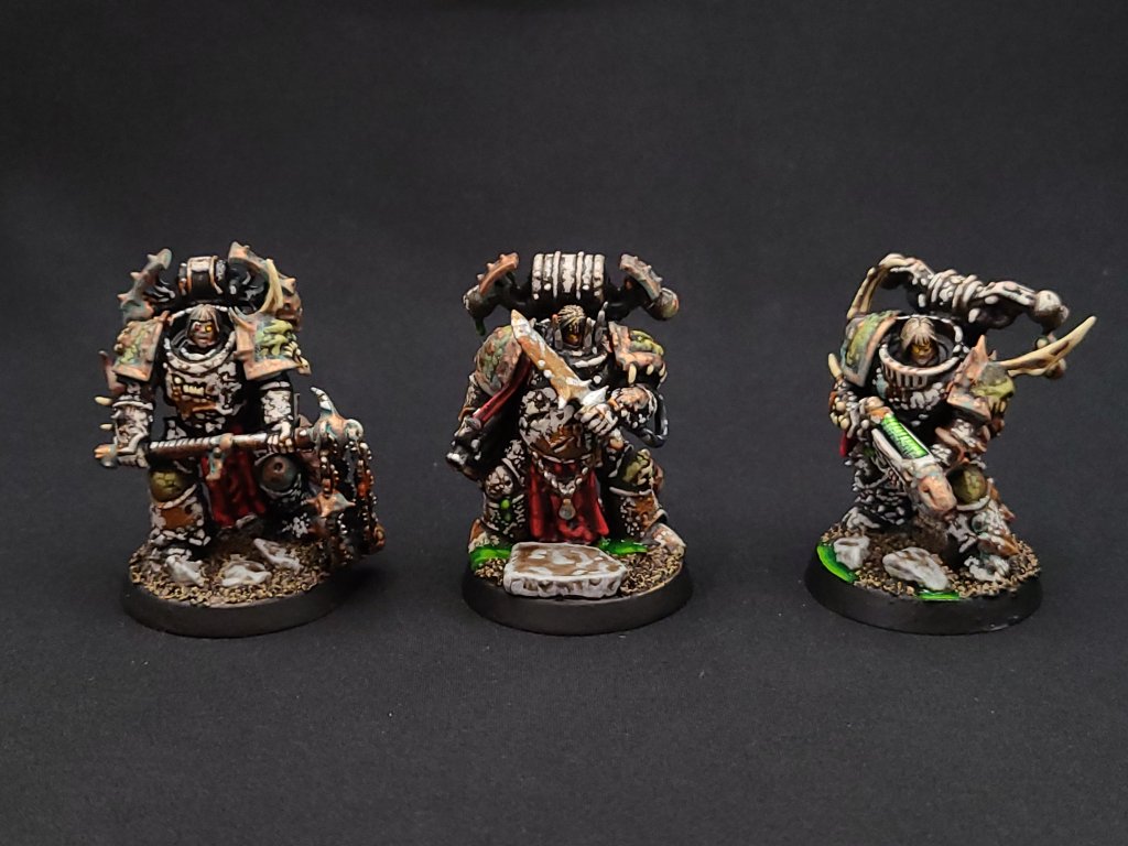 Jeff Goldblum aside, I kind of just wanted to paint more Plague-y, Chaos-y Battle Sisters, and so I did. These were a trio of Plague Marines that came with a lot that I bought online a while back and I switched out their head sculpts and made some other minor adjustments to them to bring them in line with the aesthetics of the rest of my army. The stippling and sponging blend that I use worked great for these, and the heads that I got from Wargame Exclusive really worked as a great finishing touch, especially on the Sister with the flail. I’m really happy with how that one turned out.