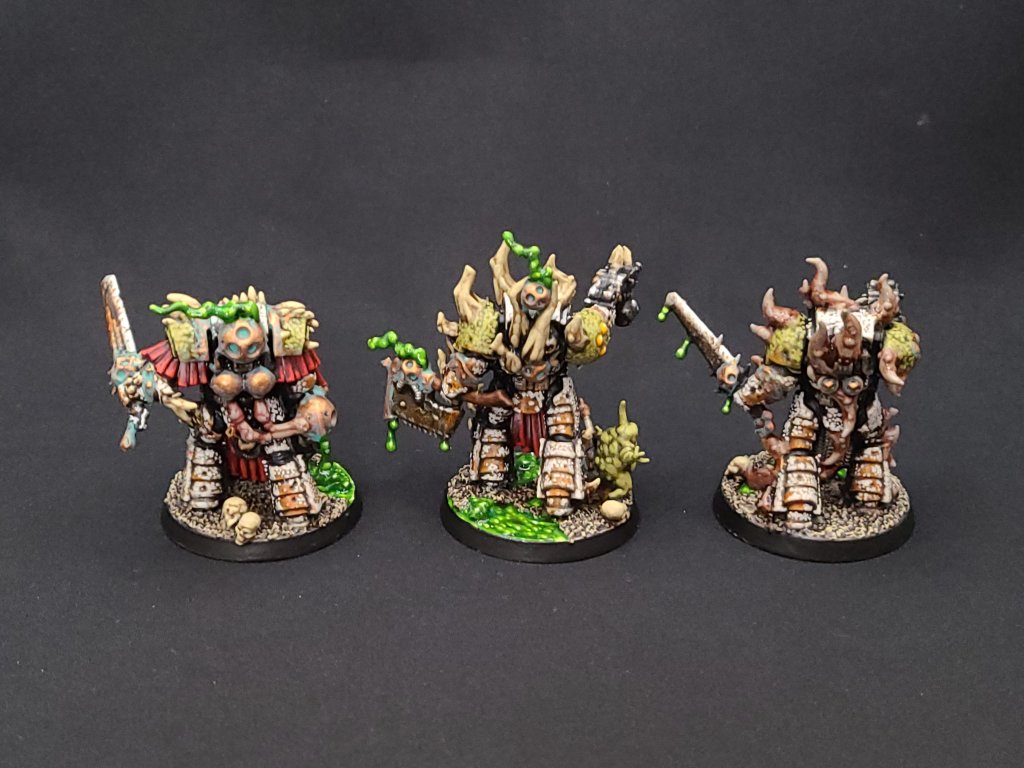 With the benefit of hindsight, repainting Felthius and his filthy lads, I appreciate how damn good these sculpts are. While I’m a big fan of non-monopose stuff for Eldar that I can play with and customize, the benefit of monopose or ETB Death Guard models is that there’s so much detail and bits of flesh and bone and slime baked into each of them and paired with some decently dynamic posing. Dynamic for Cataphractii armour, of course, but still. I approached these with the mix of sponging, stippling, and then the regular base-layer-highlight formulas that have been my standard for Death Guard up to this point. While I think I overdid it on some of the stippling, I’m quite happy with the result (and that these are finally out of my pile of shame.)