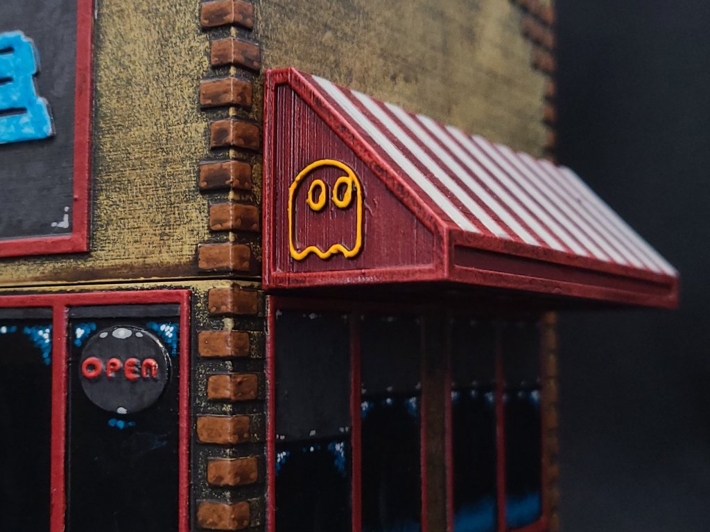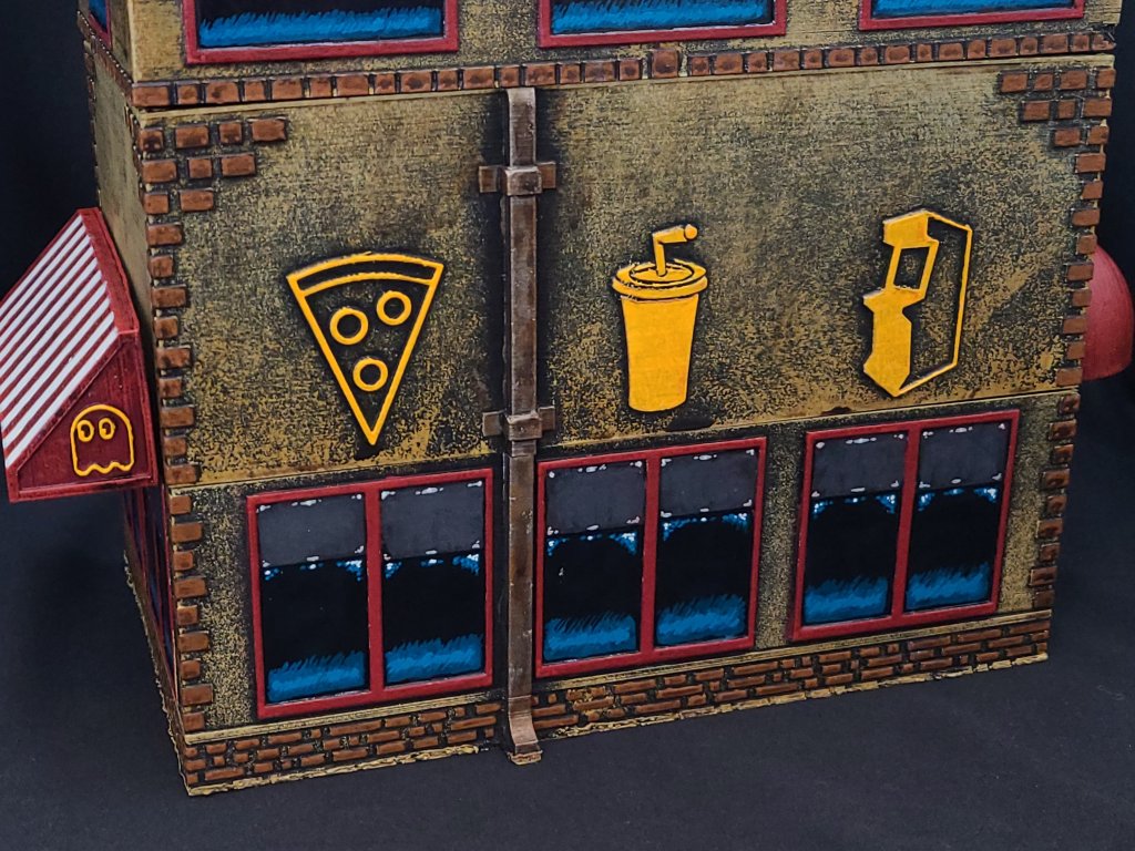 Painting this up, though I didn’t lean as far into it as I originally planned, I tried to incorporate a lot of bright colors. I’d originally wanted to tackle this with more of a “neon” aesthetic but that didn’t quite come together – still happy with how the bright yellows look on the grimy, worn-looking building after some sponge treatments on the lower coats. I did some experimenting on the big blue letters with contrast paints, though I wasn’t totally satisfied with the results I think it contrasts nicely (see what I did there?) with some of the other more traditionally painted windows, frames, bricks, and signs. I got to run with a lot of different techniques and as tedious as I found it to paint something up this big, I think it gave me a lot of useful practice out of it.