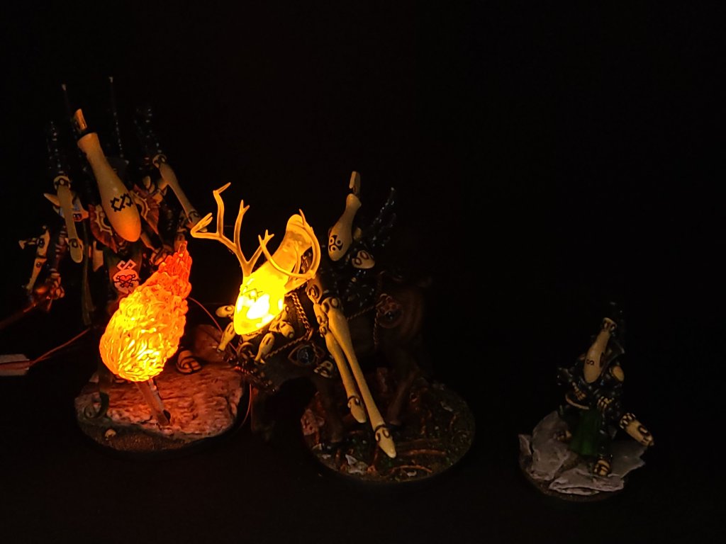 As usual, the LEDs for this build came from Evan Designs because they’ve had the best LEDs for hobbying that I’ve used to date, and they certainly didn’t let me down on this one. (Author’s note: these LEDs purchased long before the current international fiasco referenced here.) I feel like those old waterslide Eldar decals also really put in some solid work on this one, especially the clear “head” segment, because when the light’s on I feel like that black symbol just works really effectively. Most of this came together without issue, though I did have to fight a little bit with the Wraithguard’s waist to get it to sit right, and I learned the hard way that trying to get chain to maintain shape on a miniature in any way, shape or form for painting is tricky business. In the end this project was a good mix of stuff I’ve done before, stuff I wanted to try for the first time, and stuff where I just wanted to get weird.