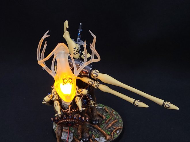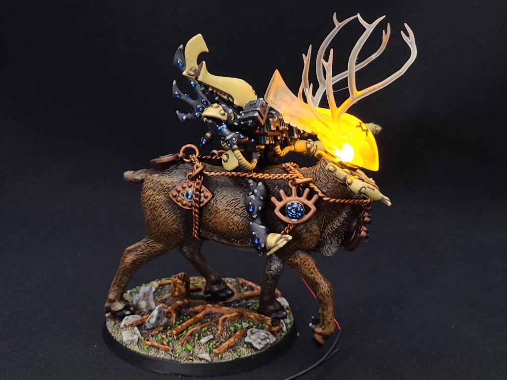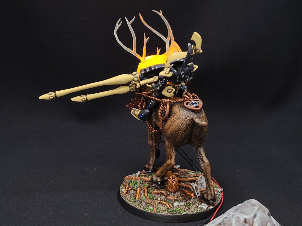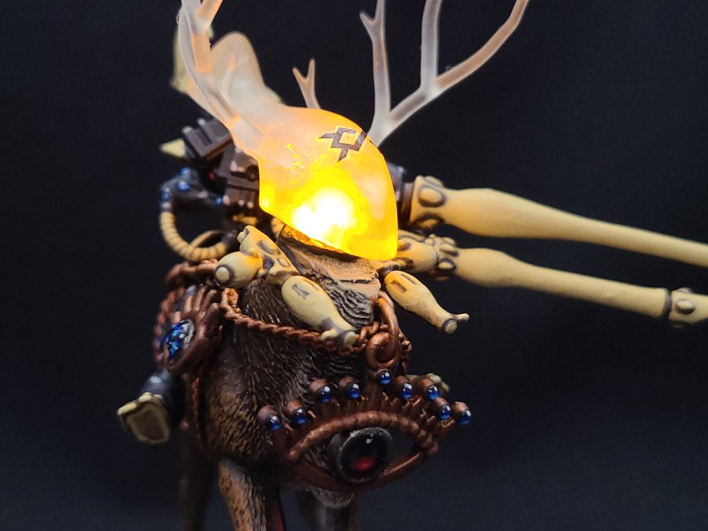 But enough about the abstract and deep stuff – I set out to build a Princess Mononoke-styled Wraithlord and I’m very happy with the result. A local friend with a 3D printer was able to build me the clear resin head for this, and the rest of it was a combination of a 65mm resin base, a Wraithguard, several extra bits, and a caribou that I picked up at Michaels here in St. John’s. What I imagined was basically a mounted Wraithlord, and while I ended up scaling it down a bit to make it work I’m still very happy with how this turned out. It’s kitted out of course with a pair of Bright Lances, one of which is actually a spare Pulse Laser from an old Falcon kit. The ornamental bits and bobs are also things I picked up at Michaels.