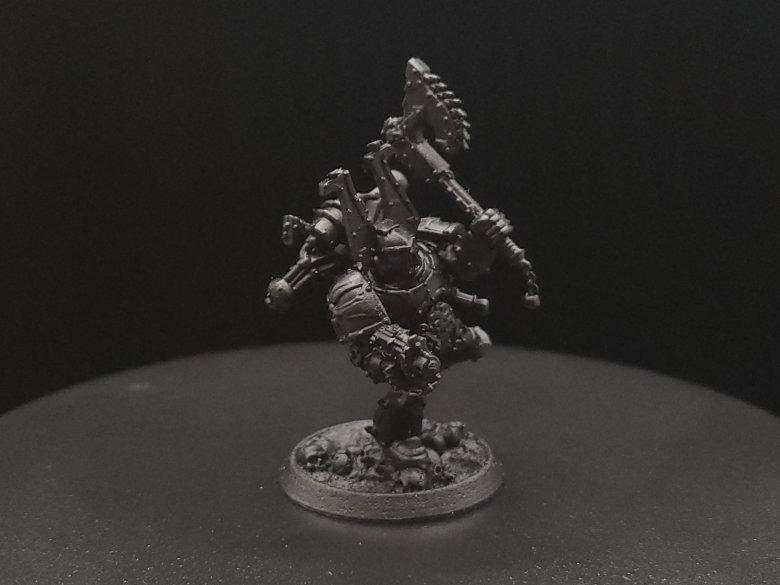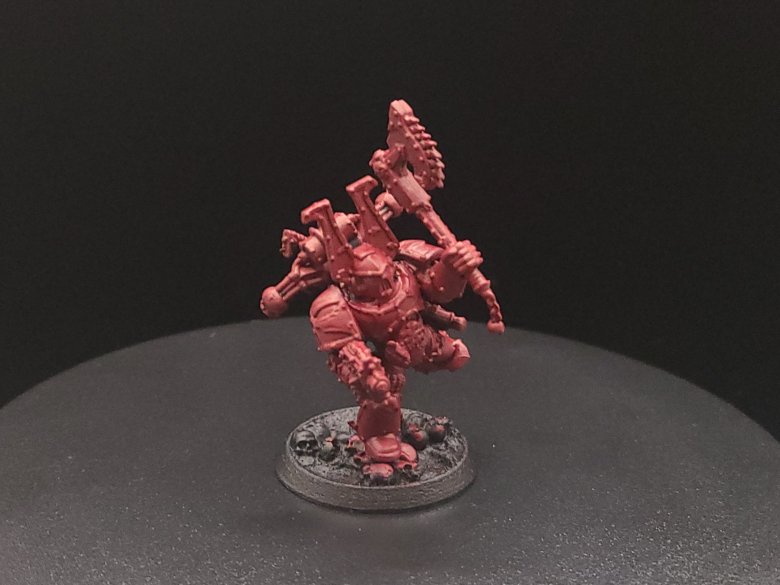 When our model is assembled, we’ll attach the model and then glue some basing sand and rocks and other bits over the bases themselves. Try not to get any on the rims, but if you do, it can always be removed with tweezers or sanded off later. When this is done, you can prime your model. For these, I suggest starting with just a flat black primer because were going to build up the red color on most of the model from there.