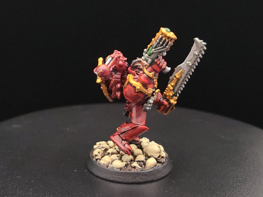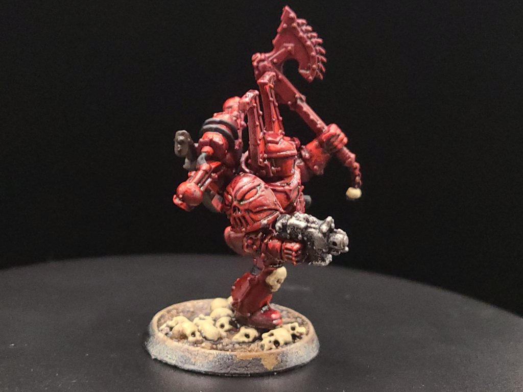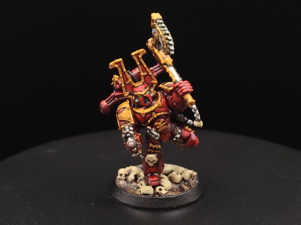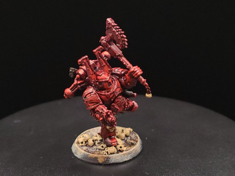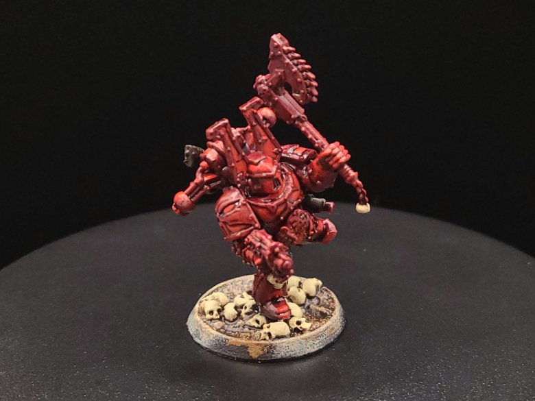 And that, start to finish, is how we turn our little dude from an unpainted gray plastic miniature to a finished Khorne Berzerker! If this goes well between the online stuff and the convention circuit, I hope to also have some tutorials done for other Chaos factions and for Aeldari, which is my personal favorite faction in the game. If you have any questions for me about the tutorial feel free to reach out to me in the comments below, or on Instagram under the handle twitchybristles, where I also post a lot of the miniatures that I paint in my spare time. Thanks again to SmashleyDraws for some of the graphics!